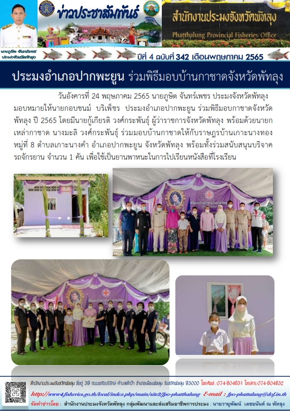 วันอังคารที่ 24 พฤษภาคม 2565 นายภูษิต จันทร์เพชร ประมงจังหวัดพัทลุง มอบหมายให้นายกอบชนม์ บริเพ็ชร ประมงอำเภอปากพะยูน ร่วมพิธีมอบกาชาดจังหวัดพัทลุง ปี 2565 โดยมีนายกุ็เกียรติ วงศ์กระพันธุ์ ผู้ว่าราชการจังหวัดพัทลุง พร้อมด้วยนายกเหล่ากาชาด นางมะลิ วงศ์กระพันธุ์ ร่วมมอบบ้านกาชาดให้กับราษฎรบ้านเกาะนางทอง หมู่ที่ 8 ตำบลเกาะนางคำ อำเภอปากพะยูน จังหวัดพัทลุง พร้อมทั้งร่วมสนับสนุนบริจาครถจักรยาน จำนวน 1 คัน เพื่อให้เป็นยานพาหนะในการไปเรียนหนังสือที่โรงเรียน