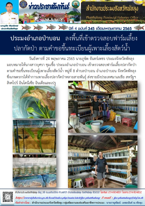 วันที่ 25 พฤษภาคม 2565 นายภูษิต จันทร์เพชร ประมงจังหวัดพัทลุง มอบหมายให้ นางสาวบุศรา ชุมเชื้อ ประมงอำเภอป่าบอน เข้าตรวจสอบฟาร์มเลี้ยงปลากัดป่า ตามคำขอขึ้นทะเบียนผู้เพาะเลี้ยงสัตว์น้ำ หมู่ที่ 8 ตำบลป่าบอน อำเภอป่าบอน จังหวัดพัทลุง ซึ่งเกษตรกรได้ทำการเพาะเลี้ยงปลากัดป่าหลายสายพันธุ์ ส่งขายยังประเทศมาเลเชีย สหรัฐฯ สิงคโปร์ อินโดนีเซีย อินเดียและเปรู