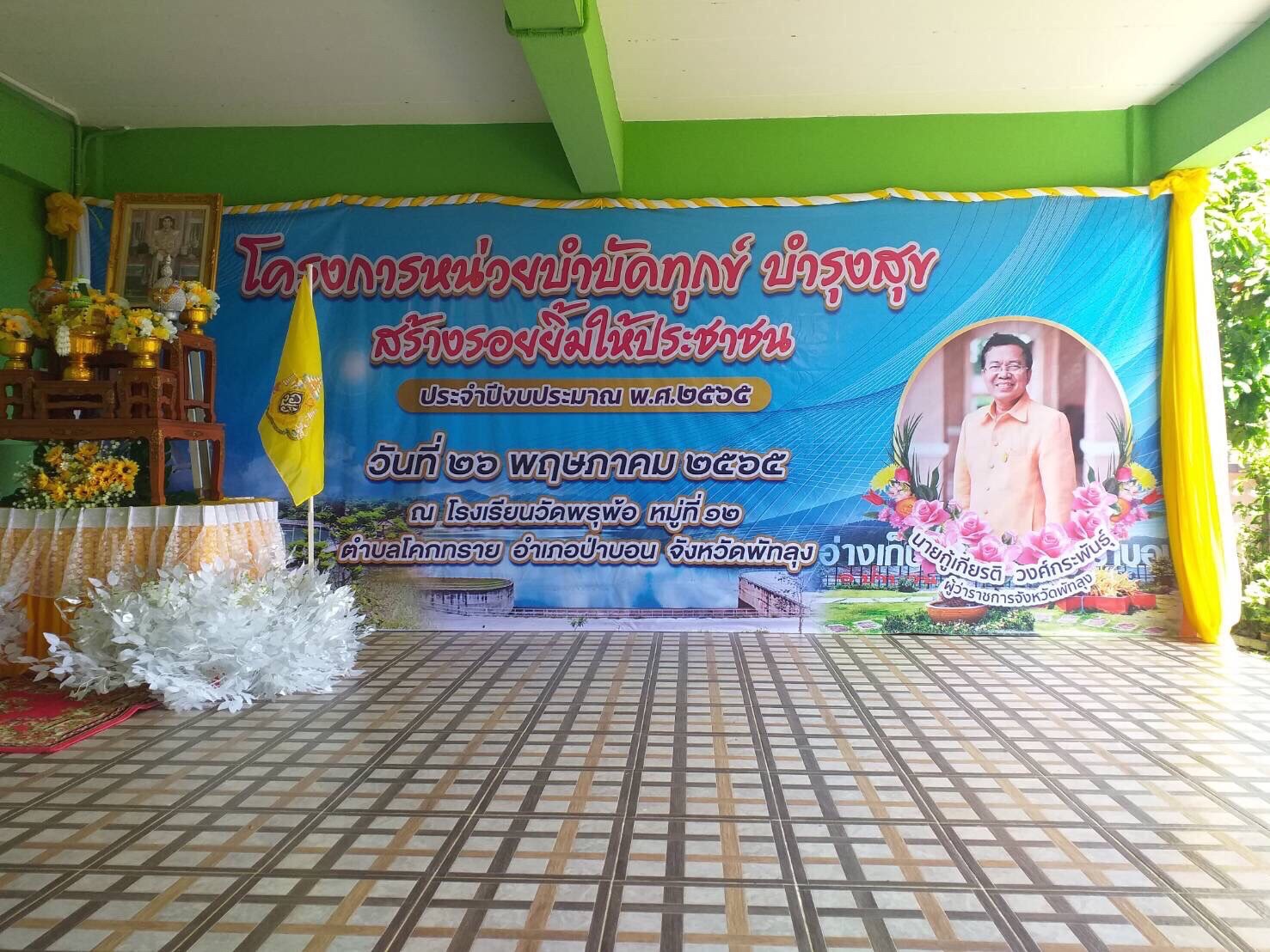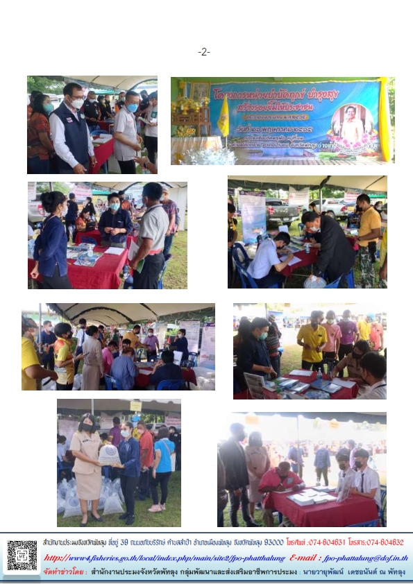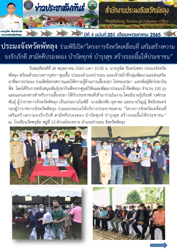 วันพฤหัสบดีที่ 26 พฤษภาคม 2565 เวลา 10.00 น. นายภูษิต จันทร์เพชร ประมงจังหวัดพัทลุง พร้อมด้วยนางสาวบุศรา ชุมเชื้อ ประมงอำเภอป่าบอน และเจ้าหน้าที่กลุ่มพัฒนาและส่งเสริมอาชีพการประมง ร่วมจัดนิทรรศการและให้ความรู้ด้านการเลี้ยงปลา โรคของปลา  แจกพันธุ์สัตว์ปลากินพืช  โดยได้รับการสนับสนุนพันธุ์ปลากินพืชจากศูนย์วิจัยและพัฒนาประมงน้ำจืดพัทลุง จำนวน 100 ถุง และแจกเอกสารสำหรับการเลี้ยงปลา ให้กับประชาชนที่เข้ามาร่วมในงาน โดยมีนายกู้เกียรติ วงศ์กระพันธุ์ ผู้ว่าราชการจังหวัดพัทลุง เป็นประธานในพิธี  นายฉัตรชัย อุสาหะ และนายวิญญ์ สิทธิเชนทร์  รองผู้ว่าราชการจังหวัดพัทลุง ร่วมออกหน่วยให้บริการประชาชนตาม “โครงการจังหวัดเคลื่อนที่ เสริมสร้างความจงรักภักดี สามัคคีปรองดอง บำบัดทุกข์ บำรุงสุข สร้างรอยยิ้มให้ประชาชน” ณ  โรงเรียนวัดพรุพ้อ หมู่ที่ 12 ตำบลโคกทราย อำเภอป่าบอน จังหวัดพัทลุง