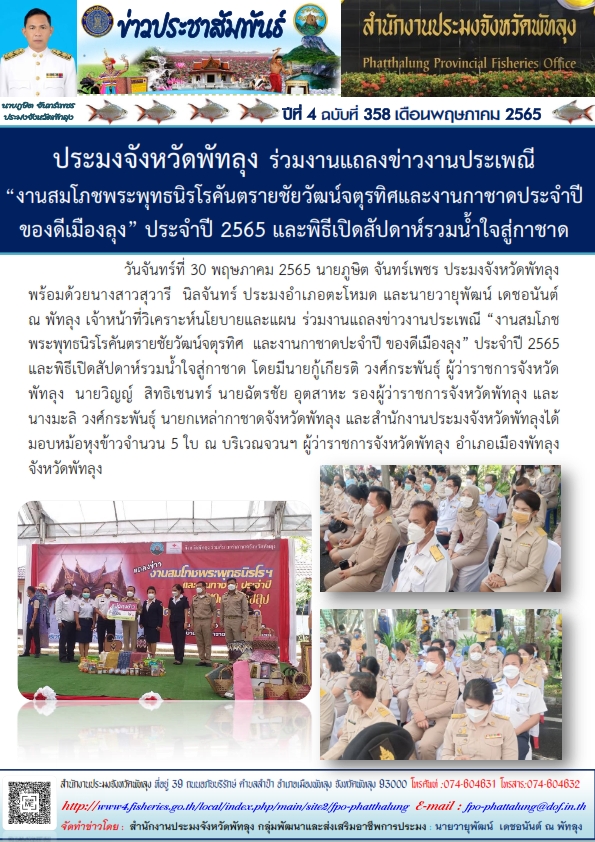 วันที่ 30 พฤษภาคม 2565 นายภูษิต จันทร์เพชร ประมงจังหวัดพัทลุง พร้อมด้วยนางสาวสุวารี นิลจันทร์ ประมงอำเภอตะโหมด และนายวายุพัฒน์ เดชอนันต์ ณ พัทลุงเจ้าหน้าที่วิเคราะห์นโยบายและแผน ร่วมงานแถลงข่าวงานประเพณี งานสมโภชพระพุทธนิรโรคันตรายชัยวัฒน์จตุรทิศและงานกาชาดประจำปีของดีเมืองลุง ประจำปี 2565 และพิธีเปิดสัปดาห์รวมน้ำใจสู่กาชาด โดยมีนายกู้เกียรติ วงศ์กระพันธุ์ ผู้ว่าราชการจังหวัดพัทลุง นายวิญญ์ สิทธิเชนทร์ นายฉัตรชัย อุตสาหะ รองผู้ว่าราชการจังหวัดพัทลุง และนางมะลิ วงศ์กระพันธุ์ นายกเหล่ากาชาดจังหวัดพัทลุง และสำนักงานประมงจังหวัด พัทลุงได้มอบหม้อหุงข้าวจำนวน 5 ใบ ณ บริเวณจวนฯ ผู้ว่าราชการจังหวัดพัทลุง อำเภอเมืองพัทลุง จังหวัดพัทลุง