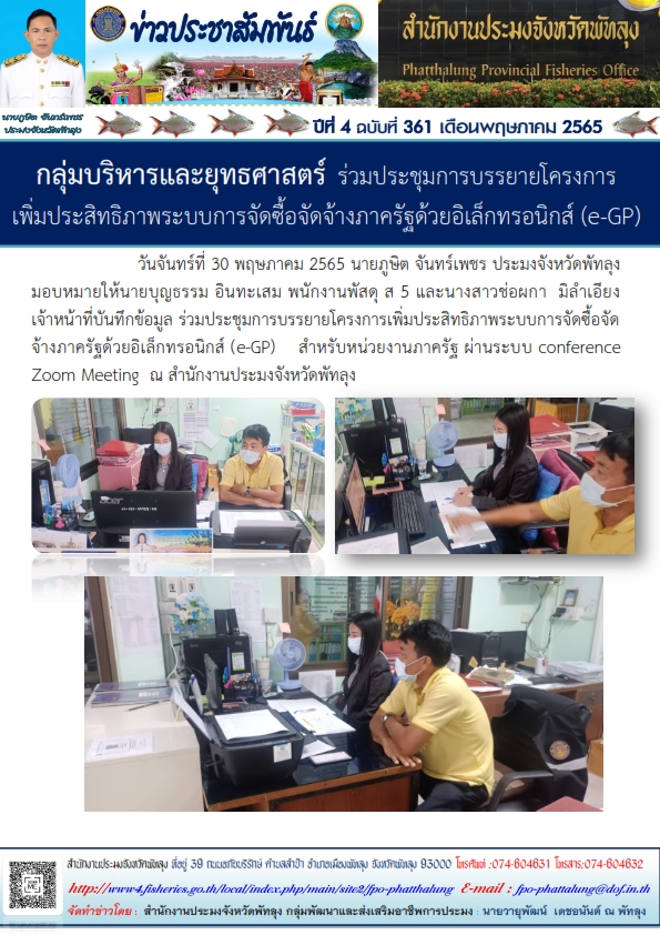 วันจันทร์ที่ 30 พฤษภาคม 2565 นายภูษิตจันทร์เพชร ประมงจังหวัดพัทลุง  มอบหมายให้นายบุญธรรมอินทะเสม พนักงานพัสดุ ส 5 และนางสาวช่อผกา  มิลำเอียง หน้าที่บันทึกข้อมูล ร่วมประชุมการบรรยายโครงการเพิ่มประสิทธิภาพระบบการจัดซื้อจัดจ้างภาครัฐด้วยอิเล็กทรอนิกส์ (e-GP) สำหรับหน่วยงานภาครัฐ ผ่านระบบ conference soom meeting  ณ สำนักงานประมงจังหวัดพัทลุง