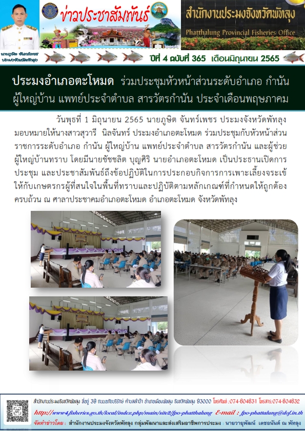 ประมงอำเภอตะโหมด ร่วมประชุมหัวหน้าส่วนระดับอำเภอ กำนัน ผู้ใหญ่บ้าน แพทย์ประจำตำบล สารวัตรกำนัน ประจำเดือนพฤษภาคม