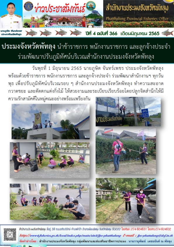วันพุธที่ 1 มิถุนายน 2565 นายภูษิต จันทร์เพชร ประมงจังหวัดพัทลุง พร้อมด้วยข้าราชการ พนักงานราชการ และลูกจ้างประจำ ร่วมพัฒนาสำนักงานฯ ทุกวันพุธ เพื่อปรับภูมิทัศน์บริเวณรอบๆ สำนักงานประมงจังหวัดพัทลุง ทำความสะอาด กวาดขยะ และตัดตกแต่งกิ่งไม้ ให้สวยงามและระเบียบเรียบร้อยโดยปลูกจิตสำนักให้มีความรักสามัคคีในหมู่คณะอย่างพร้อมเพรียงกัน