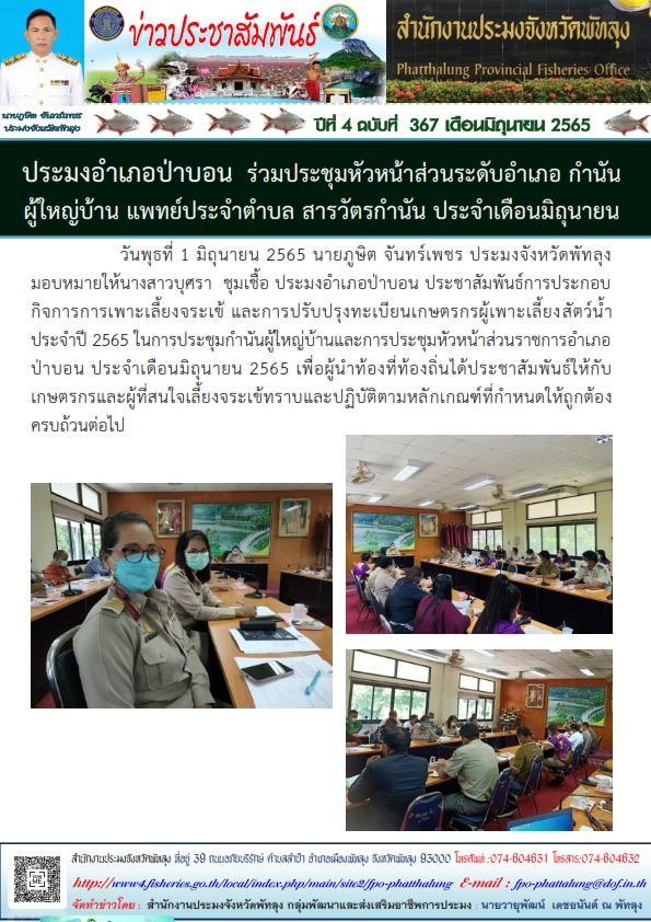 ประมงอำเภอป่าบอน ร่วมประชุมหัวหน้าส่วนระดับอำเภอ กำนัน ผู้ใหญ่บ้าน แพทย์ประจำตำบล สารวัตรกำนัน ประจำเดือนมิถุนายน
