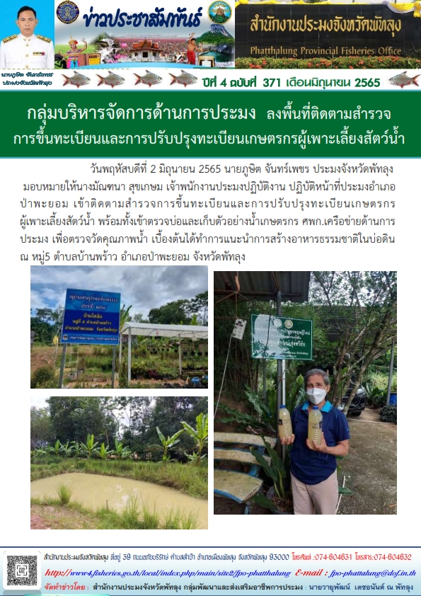 วันที่ 2 มิถุนายน 2565 นายภูษิต จันทร์เพชร ประมงจังหวัดพัทลุง  มอบหมายให้นางมัณฑนา สุขเกษม จพง.ประมงปฎิบัติงาน ปฎิบัติหน้าที่ประมงอำเภอป่าพะยอม เข้าติดตามสำรวจการขึ้นทะเบียนและการปรับปรุงทะเบียนเกษตรกรผู้เพาะเลี้ยงสัตว์น้ำ พร้อมทั้งเข้าตรวจบ่อและเก็บตัวอย่างน้ำเกษตรกร ศพก.เครือข่ายด้านการประมง เพื่อตรวจวัดคุณภาพน้ำ เบื้องต้นได้ทำการแนะนำการสร้างอาหารธรรมชาติในบ่อดิน ณ หมู่5 ตำบลบ้านพร้าว อำเภอป่าพะยอม จังหวัดพัทลุง