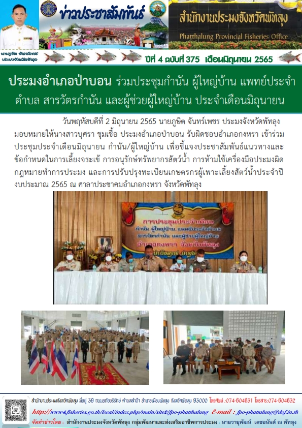 ประมงอำเภอป่าบอน ร่วมประชุมหัวหน้าส่วนระดับอำเภอ กำนัน ผู้ใหญ่บ้าน แพทย์ประจำตำบล สารวัตรกำนัน ประจำเดือนมิถุนายน