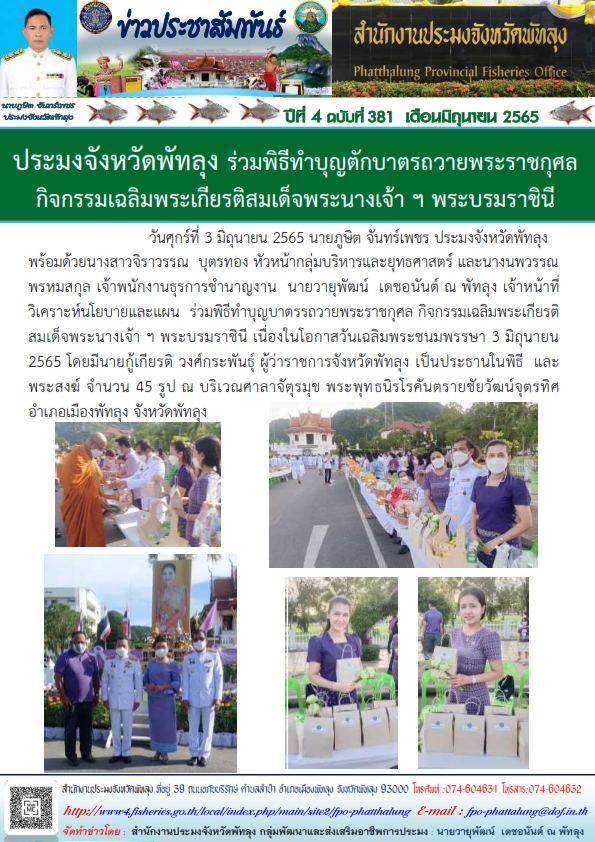 สำนักงานประมงจังหวัดพัทลุง ร่วมพิธีทำบุญตักบาตรถวายพระราชกุศลกิจกรรมเฉลิมพระเกียรติสมเด็จพระนางเจ้าฯพระบรมราชินี