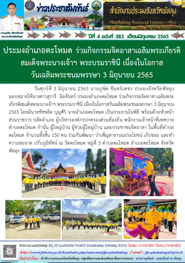 ประมงอำเภอตะโหมด ร่วมกิจกรรมจิตอาสาเฉลิมพระเกียรติ สมเด็จพระนางเจ้าฯพระบรมราชินี เนื่องในโอกาสวันเฉลิมพระชนมพรรษา 3 มิถุนายน 2565