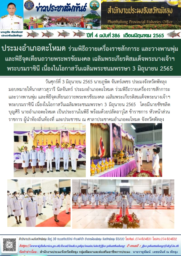 วันศุกร์ที่ 3 มิถุนายน 2565 นายภูษิต จันทร์เพชร ประมงจังหวัดพัทลุง มอบหมายให้นางสาวสุวารี นิลจันทร์ ประมงอำเภอตะโหมด ร่วมพิธีถวายเครื่องราชสักการะและวางพานพุ่ม และพิธีจุดเทียนถวายพระพรชัยมงคล เฉลิมพระเกียรติสมเด็จพระนางเจ้าฯพระบรมราชินี เนื่องในโอกาสวันเฉลิมพระชนมพรรษา 3 มิถุนายน 2565 โดยมีนายชัชชลิต บุญศิริ นายอำเภอตะโหมด เป็นพระธานในพิธี พร้อมด้วยปลัดอาวุโส ข้าราชการ หัวหน้าส่วนราชการ ผู้นำท้องที่ และประชาชน ณ ศาลาประชาคมอำเภอตะโหมด จังหวัดพัทลุง