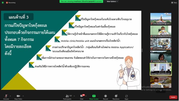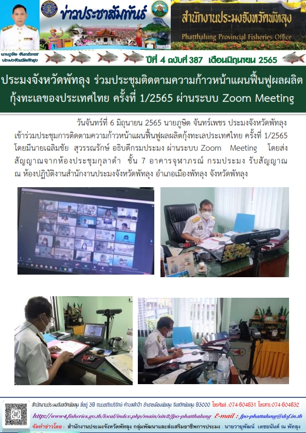 วันจันทร์ที่ 6 มิถุนายน 2565 นายภูษิต จันทร์เพชร ประมงจังหวัดพัทลุง เข้าร่วมการประชุมติดตามความก้าวหน้าแผนฟื้นฟูผลผลิตกุ้งทะเลของประเทศไทย ครั้งที่ 1/2565 โดยมีนายเฉลิมชัย  สุวรรณรักษ์ อธิบดีกรมประมง เป็นประธาน ผ่านระบบออนไลน์ Zoom Meeting โดยส่งสัญญาจาก ห้องประชุมกุลาดำ ชั้นที่ 7 อาคารจุฬาภรณ์ กรมประมง โดยรับสัญญาณ ณ สำนักงานประมงจังหวัดพัทลุง อำเภอเมือง จังหวัดพัทลุง