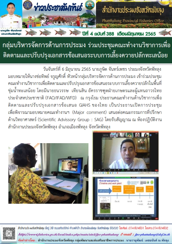 วันจันทร์ที่ 6 มิถุนายน 2565 นายภูษิต จันทร์เพชร ประมงจังหวัดพัทลุง มอบหมายให้นางช่อทิพย์ จรูญศักดิ์ หัวหน้ากลุ่มบริหารจัดการด้านการประมง เข้าร่วมประชุมคณะทำงานวิชาการเพื่อติดตามและปรับปรุงเอกสารข้อเสนอระบบการเลี้ยงควายปลักในพื้นที่ชุ่มน้ำทะเลน้อย โดยมีนายธนวรรษ  เทียนสิน อัครราชฑูตฝ่ายเกษตรและผู้แทนถาวรไทยประจำสหประชาชาติ (FAO/IFAD/WFD) ณ กรุงโรม ประธานคณะทำงานด้านวิชาการเพื่อติดตามและปรับปรุงเอกสารข้อเสนอ GIAHS ของไทย เป็นประธานเปิดการประชุม              เพื่อพิจารณามอบหมายคณะทำงานฯ  (Major comment) เสนอต่อคณะกรรมการที่ปรึกษาด้านวิทยาศาสตร์ (Scientific Advissory Group : SAG) โดยรับสัญญาณ ณ ห้องปฏิบัติงานสำนักงานประมงจังหวัดพัทลุง อำเภอเมืองพัทลุง จังหวัดพัทลุง