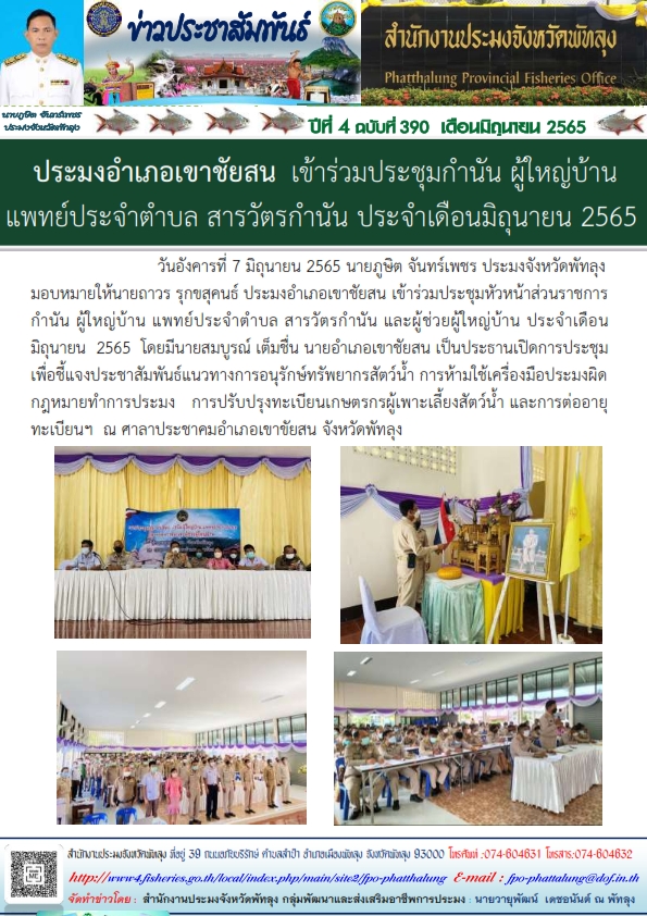 ประมงอำเภอเขาชัยสน เข้าร่วมประชุมกำนัน ผู้ใหญ่บ้าน แพทย์ประจำตำบล สารวัตรกำนัน ประจำเดือนมิถุนายน 2565