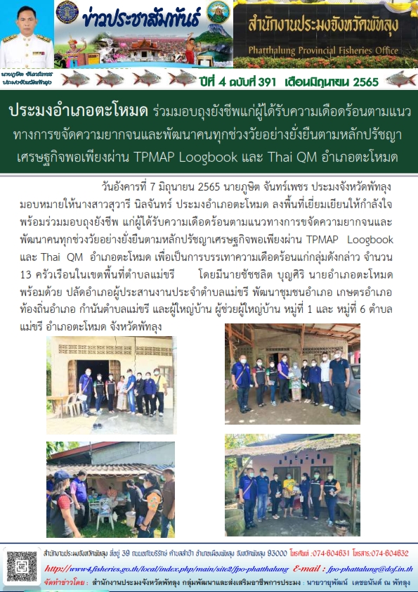วันที่ 7 มิถุนายน 2565 เวลา 09.30 น. นายภูษิต  จันทร์เพชร ประมงจังหวัดพัทลุง  มอบหมายให้นางสาวสุวารี นิลจันทร์ ประมงอำเภอตะโหมด ลงพื้นที่เยี่ยมเยียนให้กำลังใจพร้อมมอบถุงยังชีพ แก่ผู้ได้รับความเดือดร้อนตามแนวทางการขจัดความยากจนและพัฒนาคนทุกช่วงวัยอย่างยั่งยืนตามหลักปรัชญาเศรษฐกิจพอเพียงผ่าน TPMAPLoogbook และ ThaiQM อำเภอตะโหมด เพื่อเป็นการบรรเทาความเดือดร้อนแก่กลุ่มดังกล่าว จำนวน 13 ครัวเรือนในเขตพื้นที่ตำบลแม่ขรี โดยมีนายชัชชลิต  บุญศิริ  นายอำเภอตะโหมด พร้อมด้วย ปลัดอำเภอผู้ประสานงานประจำตำบลแม่ขรี พัฒนาชุมชนอำเภอ เกษตรอำเภอ ท้องถิ่นอำเภอ ประมงอำเภอ กำนันตำบลแม่ขรี และผู้ใหญ่บ้าน ผู้ช่วยผู้ใหญ่บ้าน หมู่ที่ 1 และ หมู่ที่ 6 ตำบลแม่ขรี อำเภอตะโหมด จังหวัดพัทลุง