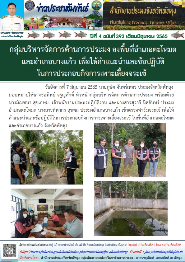 วันอังคารที่ 7 มิถุนายน 2565  นายภูษิต จันทร์เพชร  ประมงจังหวัดพัทลุง มอบหมายนางช่อทิพย์ จรูญศักดิ์ หัวหน้ากลุ่มบริหารจัดการด้านการประมง  นางมัณฑนา สุขเกษม  เจ้าพนักงานประมงปฎิบัติงาน พร้อมด้วยนางสาวสุวารี นิลจันทร์ ประมงอำเภอตะโหมด นางสาวทิพากร สุขพล ประมงอำเภอบางแก้ว เข้าตรวจฟาร์มจระเข้ เพื่อให้คำแนะนำและข้อปฎิบัติในการประกอบกิจการการเพาะเลี้ยงจระเข้ ในพื้นที่อำเภอตะโหมดและอำเภอบางแก้ว จังหวัดพัทลุง