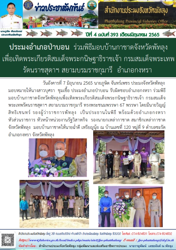 วันอังคารที่ 7 มิถุนายม 2565 นายภูษิต จันทร์เพชร ประมงจังหวัดพัทลุง มอบหมายให้นางสาวบุศรา ชุมเชื้อ ประมงอำเภอป่าบอน รับผิดชอบอำเภอกงหรา ร่วมพิธีมอบบ้านกาชาดจังหวัดพัทลุงเพื่อเทิดพระเกียรติสมเด็จพระกนิษฐาธิราชเจ้า กรมสมเด็จพระเทพรัตนราชสุดาฯสยามบรมราชกุมารี ทรงพระชนมพรรษา 67 พรรษา โดยมีนายวิญญ์ สิทธเชนทร์ รองผู้ว่าราชการจังหวัดพัทลุง เป็นประธานในพิธี พร้อมด้วยนายอำเภอกงหรา  หัวหน้าส่วนราชการ หัวหน้าหน่วยงานรัฐวิสาหกิจ รองนายกเหล่ากาชาด สมาชิกเหล่ากาชาดจังหวัดพัทลุง มอบบ้านกาชาดให้นายฉ่ำดี เหรียญนุ้ย ณ บ้านเลขที่ 120 หมู่ที่ 9 ตำบลชะรัด อำเภอกงหรา จังหวัดพัทลุง