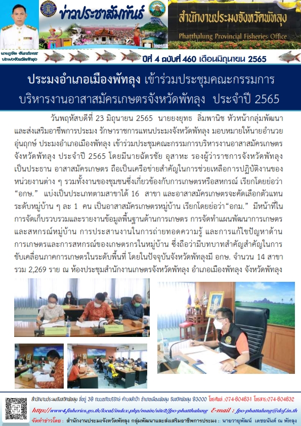 วันพฤหัสบดีที่ 23 มิถุนายน 2565 นายยงยุทธ ลิ่มพานิช หัวหน้ากลุ่มพัฒนาและส่งเสริมอาชีพการประมง รักษาราชการแทนประมงจังหวัดพัทลุง มอบหมายให้นายอำนวย อุ่นฤกษ์ ประมงอำเภอเมืองพัทลุง เข้าร่วมประชุมคณะกรรมการบริหารงานอาสาสมัครเกษตรจังหวัดพัทลุง ประจำปี 2565 โดยมีนายฉัตรชัย อุสาหะ รองผู้ว่าราชการจังหวัดพัทลุงเป็นประธาน อาสาสมคัรเกษตร ถือเป็นเครือข่ายสำคัญในการช่วยเหลือการปฏิบัติงานของหน่วยงานต่างๆ รวมทั้งงานของชุมชนซึ่งเกี่ยวข้องกับการเกษตรหรือสหกรณ์ เรียกโดยย่อว่า “อกษ.” แบ่งเป็นประเภทตามสาขาได้ 16 สาขา และอาสาสมัครเกษตรจะคัดเลือกตัวแทนระดับหมู่บ้าน ๆ ละ 1 คน เป็นอาสาสมัครเกษตรหมู่บ้าน เรียกโดยย่อว่า “อกม.” มีหน้าที่ในการจัดเก็บรวบรวมและรายงานข้อมูลพื้นฐานด้านการเกษตร การจัดทำแผนพัฒนาการเกษตรและสหกรณ์หมู่บ้าน การประสานงานในการถ่ายทอดความรู้ และการแก้ไขปัญหาด้านการเกษตรและการสหกรณ์ของเกษตรกรในหมู่บ้าน ซึ่งถือว่ามีบทบาทสำคัญสำคัญในการขับเคลื่อนภาคการเกษตรในระดับพื้นที่ โดยในปัจจุบันจังหวัดพัทลุงมี อกษ. จำนวน 14 สาขา รวม 2,269 ราย และ อกม. จำนวน 670 ราย ณ ห้องประชุมสำนักงานเกษตรจังหวัดพัทลุง อำเภอเมืองพัทลุง จังหวัดพัทลุง