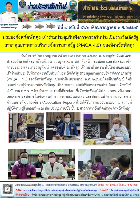 วันอังคารที่ ๒๖ กรกฎาคม ๒๕๖๕ เวลา ๐๙.๐๐-๑๒.๐๐ น. นายภาษิต จันทร์เพชร ประมงจังหวัดพัทลุง พร้อมด้วยนายยงยุทธ ลิ้มพานิช หัวหน้ากลุ่มพัฒนาและส่งเสริมอาชีพ การประมง และนายวายุพัฒน์ เดชอนันต์ ณ พัทลุง เจ้าหน้าที่วิเคราะห์นโยบายและแผน เข้าร่วมประชุมรับฟังการตรวจรับประเมินรางวัลเลิศรัฐ สาขาคุณภาพการบริหารจัดการภาครัฐ (PMOA 4.0) ของจังหวัดพัทลุง ประจำปีงบประมาณ พ.ศ. ๒๕๖๕ โดยมีนายวิญญ์ สิทธิ เชนทร์ รองผู้ว่าราชการจังหวัดพัทลุง เป็นประธาน และได้รับการตรวจประเมินจากเจ้าหน้าที่ สำนักงาน ก.พ.ร. พร้อมด้วยหน่วยงานที่เกี่ยวข้อง ซึ่งจังหวัดพัทลุงได้ผ่านการตรวจพิจารณา เอกสารการสมัครฯ ในขั้นตอนที่ ๑ การประเมินตนเอง และขั้นตอนที่ ๑ รายงานผลการ ดำเนินการพัฒนาองค์การ (Application Report) ซึ่งจะได้รับการตรวจประเมินฯ ณ สถานที่ ปฏิบัติงาน สู่ขั้นตอนที่ ๓ ณ ห้องประชุมกาบบัว ขึ้น ๕ ศาลากลางจังหวัดพัทลุง จังหวัดพัทลุง