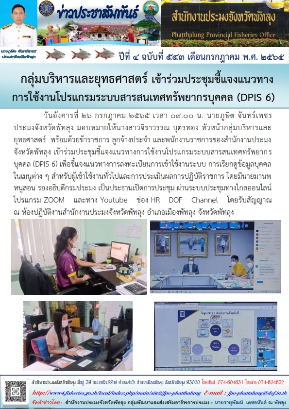 วันที่ 26 กรกฎาคม 2565 เวลา 9.00 - 16.30 น. นายภูษิต จันทร์เพชร ประมงจังหวัดพัทลุง มอบหมายให้นางสาวจิราวรรณ บุตรทอง หัวหน้ากลุ่มบริหารและยุทธศาสตร์  พร้อมด้วยข้าราชการ ลูกจ้างประจำ และพนักงานราชการของสำนักงานประมงจังหวัดพัทลุง เข้าร่วมประชุมชี้แจงแนวทางการใช้งานโปรแกรมระบบสารสนเทศทรัพยากรบุคคล (DPIS 6) เพื่อชี้แจงแนวทางการลงทะเบียนการเข้าใช้งานระบบ การเรียกดูข้อมูลบุคคลในเมนูต่าง ๆ สำหรับผู้เข้าใช้งานทั่วไปและการประเมินผลการปฏิบัติราชการ โดยมีนายมานพ หนูสอน รองอธิบดีกรมประมง เป็นประธานเปิดการประชุม ผ่านระบบประชุมทางไกลออนไลน์โปรแกรม ZOOM และทาง Youtube ช่อง HR DOF Channel โดยรับสัญญาณ ณ ห้องปฏิบัติงานสำนักงานประมงจังหวัดพัทลุง อำเภอเมืองพัทลุง จังหวัดพัทลุง