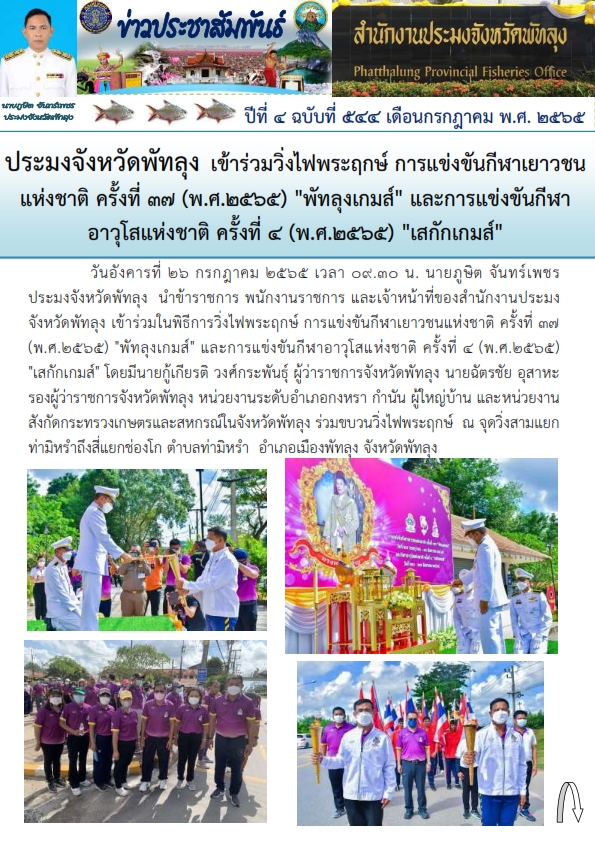 วันอังคารที่ ๒๖ กรกฎาคม ๒๕๖๕ เวลา ๐๙.๓๐ น. นายภูษิต จันทร์เพชร ประมงจังหวัดพัทลุง นำข้าราชการ พนักงานราชการ และเจ้าหน้าที่ของสำนักงานประมง จังหวัดพัทลุง เข้าร่วมในพิธีการวิ่งไฟพระฤกษ์ การแข่งขันกีฬาเยาวชนแห่งชาติ ครั้งที่ ๓๗ (พ.ศ.๒๕๖๕) "พัทลุงเกมส์” และการแข่งขันกีฬาอาวุโสแห่งชาติ ครั้งที่ ๔ (พ.ศ. ๒๕๑๕) "เสกเกมส์” โดยมีนายกู้เกียรติ วงศ์กระพันธุ์ ผู้ว่าราชการจังหวัดพัทลุง นายฉัตรชัย อุสาหะ รองผู้ว่าราชการจังหวัดพัทลุง หน่วยงานระดับอำเภอกงหรา กำนัน ผู้ใหญ่บ้าน และหน่วยงาน สังกัดกระทรวงเกษตรและสหกรณ์ในจังหวัดพัทลุง ร่วมขบวนวิ่งไฟพระฤกษ์ ณ จุดวิ่งสามแยก ท่ามิหรำถึงสี่แยกของโก ตำบลท่ามิหรา อำเภอเมืองพัทลุง จังหวัดพัทลุง