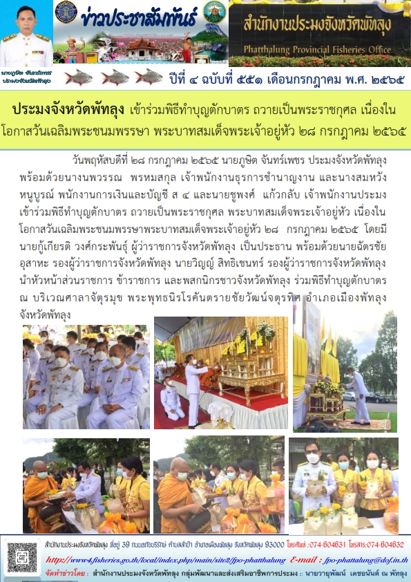 สำนักงานประมงจังหวัดพัทลุง  เข้าร่วมพิธีทำบุญตักบาตร ถวายเป็นพระราชกุศล พระบาทสมเด็จพระเจ้าอยู่หัว เนื่องในโอกาสวันเฉลิมพระชนมพรรษาพระบาทสมเด็จพระเจ้าอยู่หัว 28 กรกฎาคม 2565..คลิก