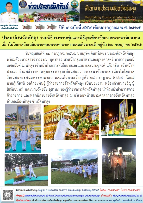 วันพฤหัสบดีที่ 28 กรกฎาคม 2565 นายภูษิต จันทร์เพชร ประมงจังหวัดพัทลุง   พร้อมด้วยนางสาวจิราวรรณ  บุตรทอง หัวหน้ากลุ่มบริหารและยุทธศาสตร์ นายวายุพัฒน์ เดชอนันต์ ณ พัทลุง เจ้าหน้าที่วิเคราะห์นโยบายและแผน และนายชูพงศ์  แก้วกลับ  เจ้าหน้าที่ประมง ร่วมพิธีวาง พานพุ่ม และพิธีจุดเทียนชัยถวายพระพรชัยมงคล เนื่องในโอกาสวันเฉลิม            พระชนมพรรษาพระบาทสมเด็จพระเจ้าอยู่หัว 28 กรกฎาคม 2565  โดยมี นายกู้เกียรติ วงศ์กระพันธุ์ ผู้ว่าราชการจังหวัดพัทลุง เป็นประธาน พร้อมด้วยนายวิญญ์ สิทธิเชนทร์  และนายฉัตรชัย อุสาหะ   รองผู้ว่าราชการจังหวัดพัทลุง นำหัวหน้าส่วนราชการ ข้าราชการ และพสกนิกรชาวจังหวัดพัทลุง ณ บริเวณหน้าสนามศาลากลางจังหวัดพัทลุง อำเภอเมืองพัทลุง จังหวัดพัทลุง