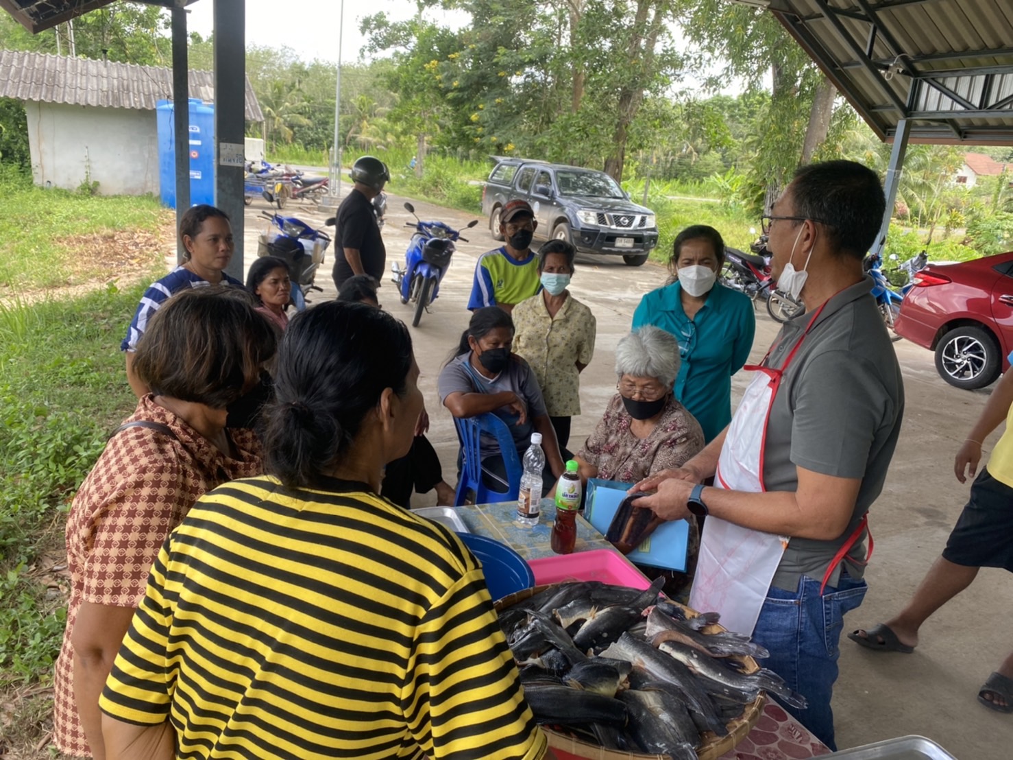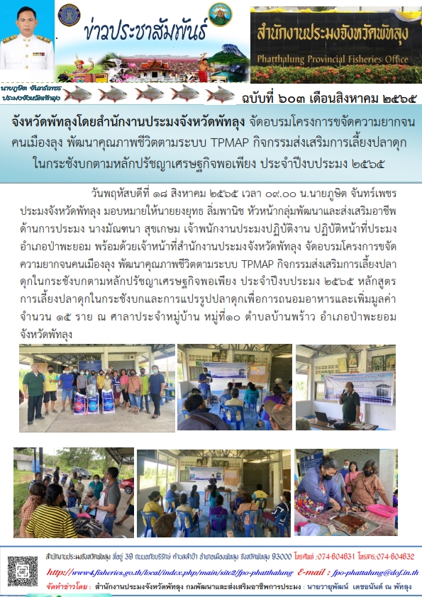 วันพฤหัสบดีที่ 18 สิงหาคม 2565 เวลา 09.00 น.นายภูษิต จันทร์เพชร       ประมงจังหวัดพัทลุง มอบหมายให้นายยงยุทธ ลิ่มพานิช หัวหน้ากลุ่มพัฒนาและส่งเสริมอาชีพด้านการประมง นางมัณฑนา สุขเกษม เจ้าพนักงานประมงปฏิบัติงาน ปฏิบัติหน้าที่ประมงอำเภอป่าพะยอม พร้อมด้วยเจ้าหน้าที่สำนักงานประมงจังหวัดพัทลุง จัดอบรมโครงการขจัดความยากจนคนเมืองลุง พัฒนาคุณภาพชีวิตตามระบบ TPMAP กิจกรรมส่งเสริมการเลี้ยงปลาดุกในกระชังบกตามหลักปรัชญาเศรษฐกิจพอเพียง ประจำปีงบประมง 2565 หลักสูตร         การเลี้ยงปลาดุกในกระชังบกและการแปรรูปปลาดุกเพื่อการถนอมอาหารและเพิ่มมูลค่า             จำนวน 15 ราย ณ ศาลาประจำหมู่บ้าน หมู่ที่10 ตำบลบ้านพร้าว อำเภอป่าพะยอม            จังหวัดพัทลุง