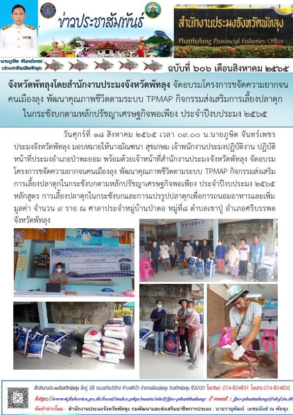 จังหวัดพัทลุงโดยสานักงานประมงจังหวัดพัทลุง จัดอบรมโครงการขจัดความยากจน คนเมืองลุง พัฒนาคุณภาพชีวิตตามระบบ TPMAP กิจกรรมส่งเสริมการเลี้ยงปลาดุก ในกระชังบกตามหลักปรัชญาเศรษฐกิจพอเพียง ประจาปีงบประมง 2565