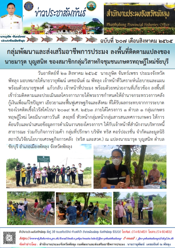 วันอาทิตย์ที่ 21 สิงหาคม 2565  นายภูษิต จันทร์เพชร ประมงจังหวัดพัทลุง มอบหมายให้นายวายุพัฒน์ เดชอนันต์ ณ พัทลุง เจ้าหน้าที่วิเคราะห์นโยบายและแผน พร้อมด้วยนายชูพงศ์  แก้วกลับ เจ้าหน้าที่ประมง พร้อมด้วยหน่วยงานที่เกี่ยวข้อง ลงพื้นที่          เข้าร่วมติดตามและประเมินผลโครงการภายใต้พระราชกำหนดให้อำนาจกระทรวงการคลัง            กู้เงินเพื่อแก้ไขปัญหา เยียวยาและฟื้นฟูเศรษฐกิจและสังคม ที่ได้รับผลกระทบจากการระบาดของโรคติดเชื้อไวรัสโคโรนา 2019 พ.ศ. ๒๕๖๓ ภายใต้โครงการ ๑ ตำบล ๑ กลุ่มเกษตรทฤษฎีใหม่ โดยมีนางสาววันดี  สงฤทธิ์ หัวหน้ากลุ่มหน้ากลุ่มสารสนเทศการเกษตร ให้การต้อนรับและนำเสนอข้อมูลการดำเนินงานของโครงการฯ ให้กับเจ้าหน้าที่สำนักงานบริหารหนี้สาธารณะ ร่วมกับกิจการร่วมค้า กลุ่มที่ปรึกษา บริษัท ทริส คอร์ปอเรชั่น จำกัดและมูลนิธิสถาบันวิจัยนโยบายเศรษฐกิจการคลัง  (ทริส และสวค.) ณ แปลงนายมารุต บุญสนิท ตำบล   ชัยบุรี อำเภอเมืองพัทลุง จังหวัดพัทลุงวันอาทิตย์ที่ 21 สิงหาคม 2565  นายภูษิต จันทร์เพชร ประมงจังหวัดพัทลุง มอบหมายให้นายวายุพัฒน์ เดชอนันต์ ณ พัทลุง เจ้าหน้าที่วิเคราะห์นโยบายและแผน พร้อมด้วยนายชูพงศ์  แก้วกลับ เจ้าหน้าที่ประมง พร้อมด้วยหน่วยงานที่เกี่ยวข้อง ลงพื้นที่          เข้าร่วมติดตามและประเมินผลโครงการภายใต้พระราชกำหนดให้อำนาจกระทรวงการคลัง            กู้เงินเพื่อแก้ไขปัญหา เยียวยาและฟื้นฟูเศรษฐกิจและสังคม ที่ได้รับผลกระทบจากการระบาดของโรคติดเชื้อไวรัสโคโรนา 2019 พ.ศ. ๒๕๖๓ ภายใต้โครงการ ๑ ตำบล ๑ กลุ่มเกษตรทฤษฎีใหม่ โดยมีนางสาววันดี  สงฤทธิ์ หัวหน้ากลุ่มหน้ากลุ่มสารสนเทศการเกษตร ให้การต้อนรับและนำเสนอข้อมูลการดำเนินงานของโครงการฯ ให้กับเจ้าหน้าที่สำนักงานบริหารหนี้สาธารณะ ร่วมกับกิจการร่วมค้า กลุ่มที่ปรึกษา บริษัท ทริส คอร์ปอเรชั่น จำกัดและมูลนิธิสถาบันวิจัยนโยบายเศรษฐกิจการคลัง (ทริส และสวค.) ณ แปลงนายมารุต บุญสนิท ตำบลชัยบุรี อำเภอเมืองพัทลุง จังหวัดพัทลุง