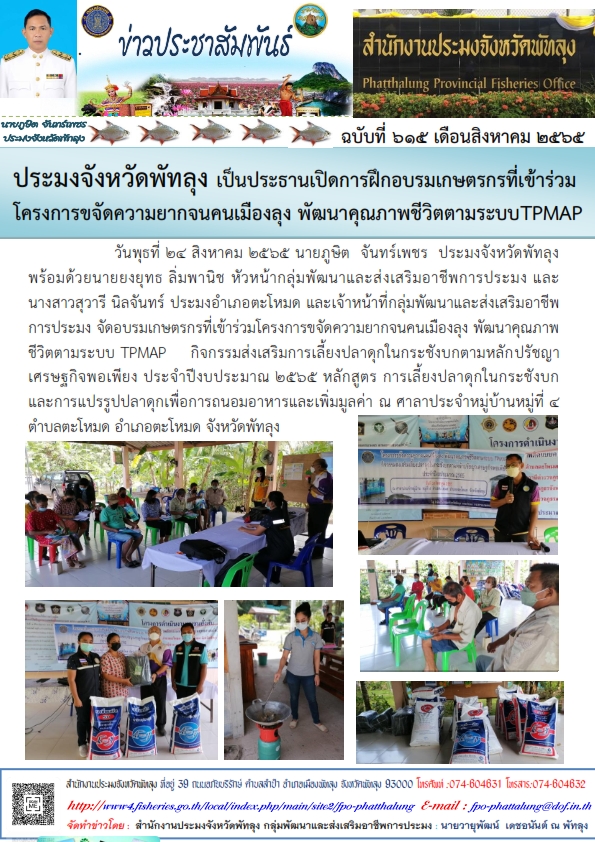ประมงจังหวัดพัทลุง เป็นประธานเปิดการฝึกอบรมเกษตรกรที่เข้าร่วมโครงการขจัดความยากจนคนเมืองลุง พัฒนาคุณภาพชีวิตตามระบบTPMAP