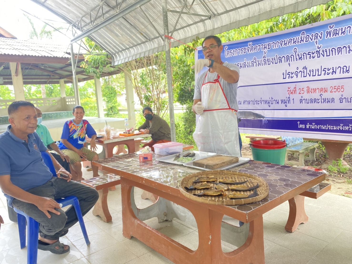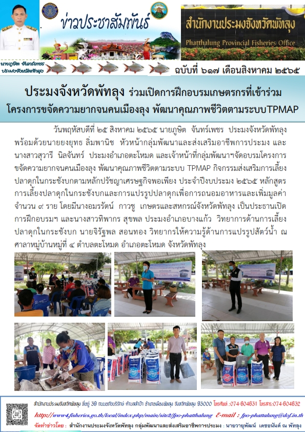 วันพฤหัสบดีที่ 25 สิงหาคม 2565 นายภูษิต  จันทร์เพชร  ประมงจังหวัดพัทลุง  พร้อมด้วยนายยงยุทธ ลิ่มพานิช  หัวหน้ากลุ่มพัฒนาและส่งเสริมอาชีพการประมง และนางสาวสุวารี  นิลจันทร์  ประมงอำเภอตะโหมด และเจ้าหน้าที่กลุ่มพัฒนาฯจัดอบรมโครงการขจัดความยากจนคนเมืองลุง พัฒนาคุณภาพชีวิตตามระบบ TPMAP กิจกรรมส่งเสริมการเลี้ยงปลาดุกในกระชังบกตามหลักปรัชญาเศรษฐกิจพอเพียง ประจำปีงบประมง 2565 หลักสูตร การเลี้ยงปลาดุกในกระชังบกและการแปรรูปปลาดุกเพื่อการถนอมอาหารและเพิ่มมูลค่า  จำนวน 9 ราย โดยมีนางอมรรัตน์  กาวชู  เกษตรและสหกรณ์จังหวัดพัทลุง เป็นประธานเปิดการฝึกอบรมฯ และนางสาวทิพากร สุขพล ประมงอำเภอบางแก้ว  วิทยาการด้านการเลี้ยง ปลาดุกในกระชังบก นายจิรัฐพล สอนทอง วิทยากรให้ความรู้ด้านการแปรรูปสัตว์น้ำ ณ ศาลาหมู่บ้านหมู่ที่ 4 ตำบลตะโหมด อำเภอตะโหมด จังหวัดพัทลุง
