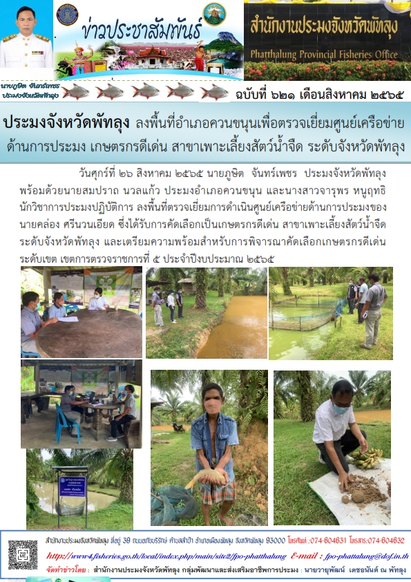ประมงจังหวัดพัทลุง ลงพื้นที่อำเภอควนขนุนเพื่อตรวจเยี่ยมศูนย์เครือข่าย  ด้านการประมง เกษตรกรดีเด่น สาขาเพาะเลี้ยงสัตว์น้ำจืด ระดับจังหวัดพัทลุง..คลิก