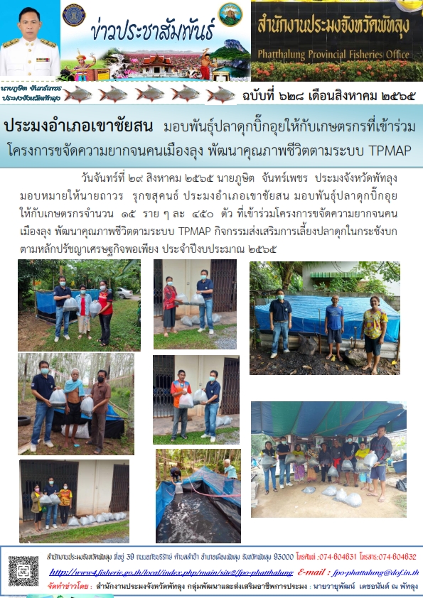 วันจันทร์ที่ 29 สิงหาคม 2565 นายภูษิต  จันทร์เพชร  ประมงจังหวัดพัทลุง    มอบหมายให้นายถาวร  รุกขสุคนธ์ ประมงอำเภอเขาชัยสน มอบพันธุ์ปลาดุกบิ๊กอุย  ให้กับเกษตรกรจำนวน  15  ราย ๆ ละ  450  ตัว ที่เข้าร่วมโครงการขจัดความยากจนคนเมืองลุง พัฒนาคุณภาพชีวิตตามระบบ TPMAP กิจกรรมส่งเสริมการเลี้ยงปลาดุกในกระชังบกตามหลักปรัชญาเศรษฐกิจพอเพียง ประจำปีงบประมาณ 2565
