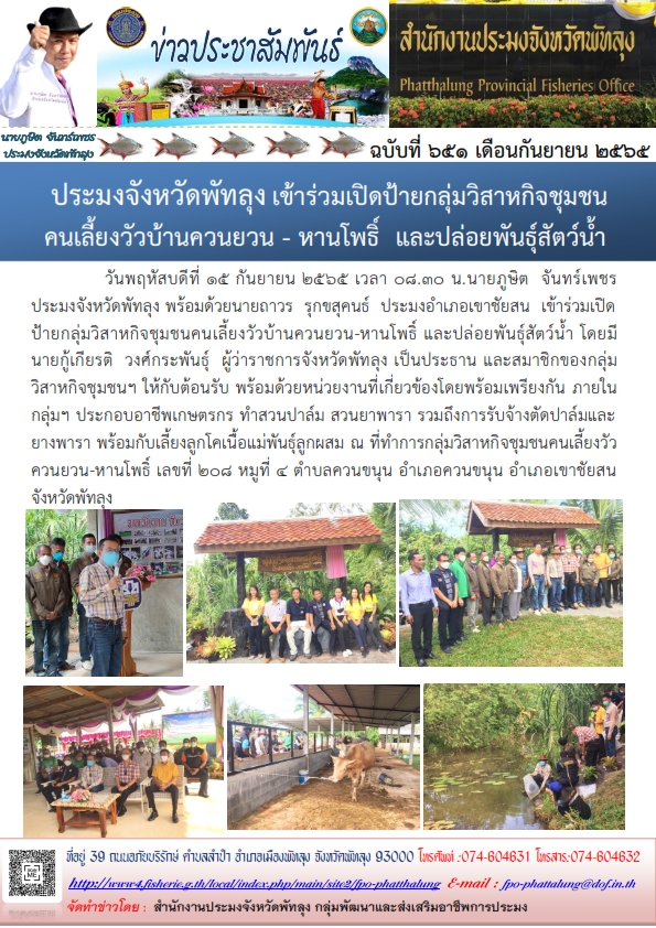 ประมงจังหวัดพัทลุง เข้าร่วมเปิดป้ายกลุ่มวิสาหกิจชุมชน คนเลี้ยงวัวบ้านควนยวน - หานโพธิ์  และปล่อยพันธุ์สัตว์น้ำ..คลิก