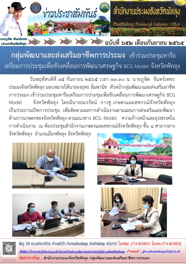 กลุ่มพัฒนาและส่งเสริมอาชีพการประมง  เข้าร่วมประชุมหารือ เตรียมการประชุมเพื่อขับเคลื่อนการพัฒนาเศรษฐกิจ BCG Model จังหวัดพัทลุง..คลิก