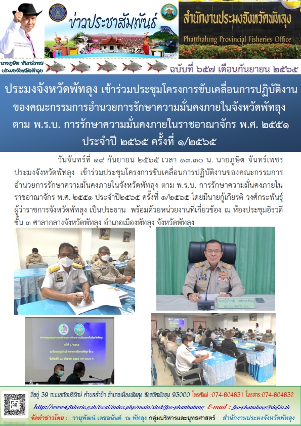 ประมงจังหวัดพัทลุง เข้าร่วมประชุมโครงการขับเคลื่อนการปฏิบัติงาน ของคณะกรรมการอำนวยการรักษาความมั่นคงภายในจังหวัดพัทลุง ตาม พ.ร.บ. การรักษาความมั่นคงภายในราชอาณาจักร พ.ศ. 2551 ประจำปี 2565 ครั้งที่ 1/2565