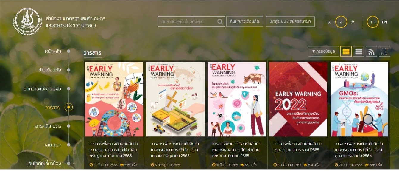 วารสารเผยแพร่ ติดตามข่าวสาร สำนักงานมาตรฐานสินค้าเกษตรและอาหารแห่งชาติ (มกอช.)  https://warning.acfs.go.th/th/journal หรือ ทาง http://www.facebook.com/acfsearlywarning