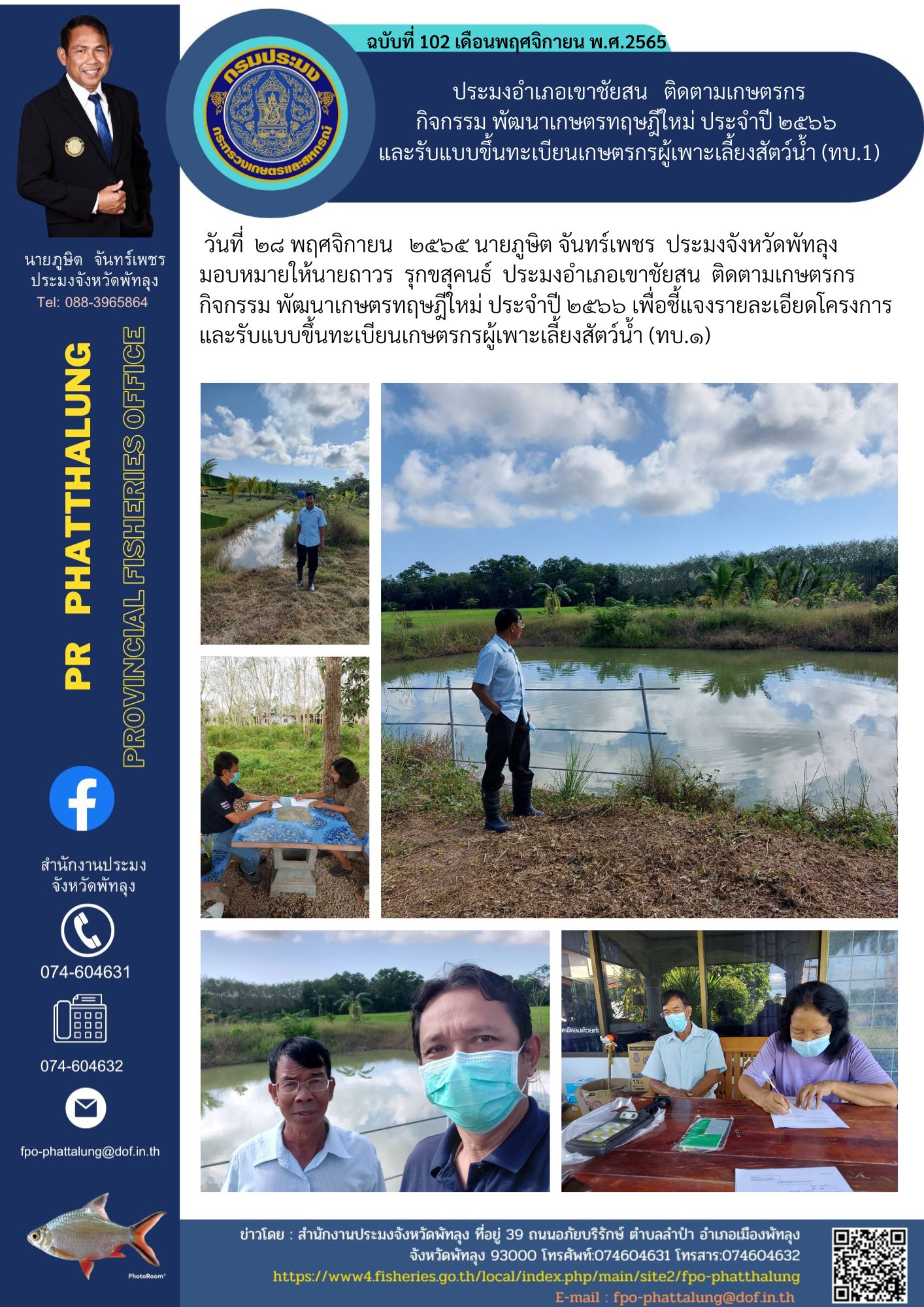 วันที่ ๒๘ พฤศจิกายน ๒๕๖๕ นายภูษิต จันทร์เพชร ประมงจังหวัดพัทลุง มอบหมายให้นายถาวร รุกขสุคนธ์ ประมงอำเภอเขาชัยสน ติดตามเกษตรกรกิจกรรม พัฒนาเกษตรทฤษฎีใหม่ ประจำปี ๒๕๖๖ เพื่อชี้แจงรายละเอียดโครงการและรับแบบขึ้นทะเบียนเกษตรกรผู้เพาะเลี้ยงสัตว์น้ำ (ทบ.๑)