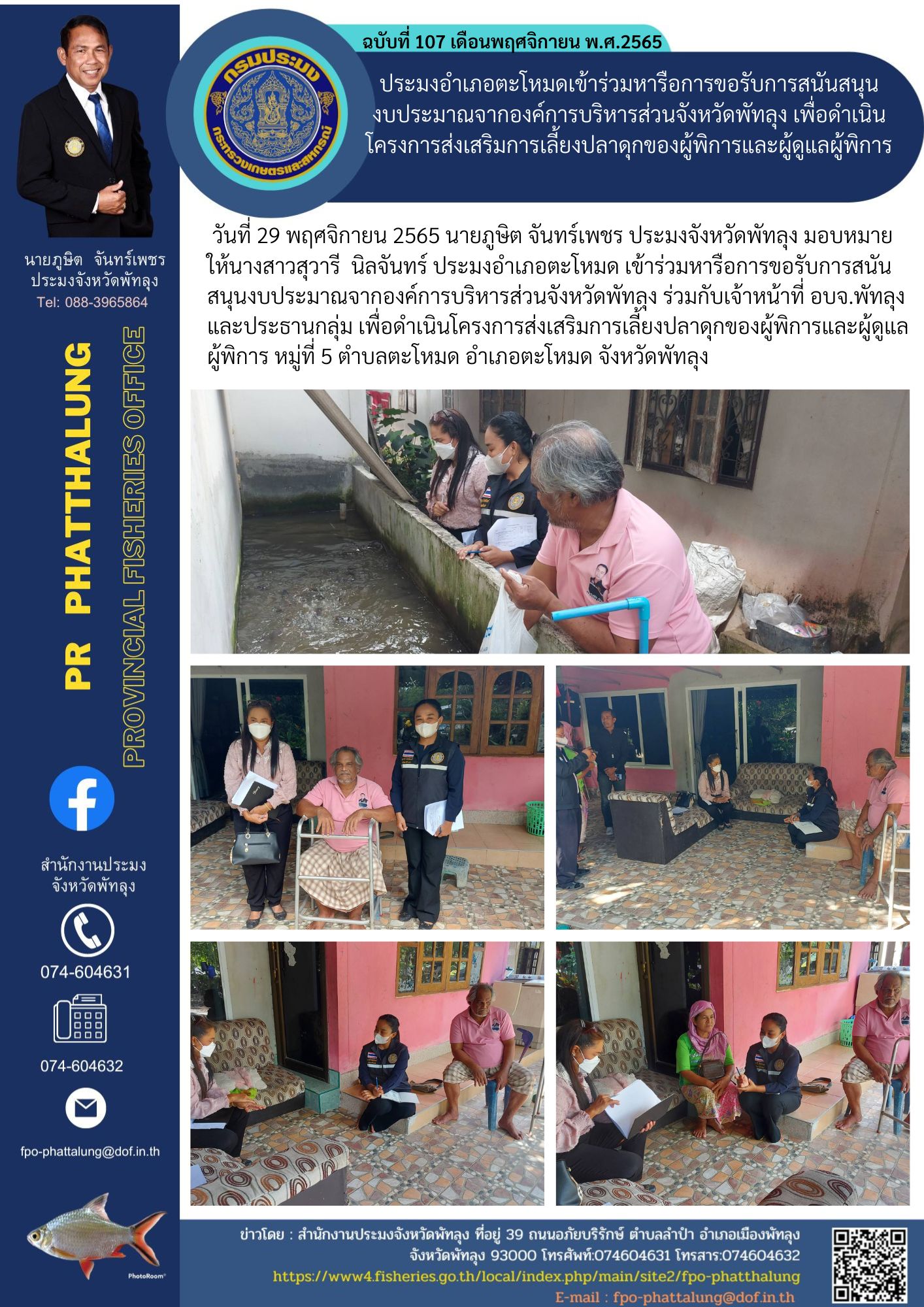 วันที่ 29 พฤศจิกายน 2565 นายภูษิต จันทร์เพชร ประมงจังหวัดพัทลุง มอบหมายให้นางสาวสุวารี นิลจันทร์ ประมงอำเภอตะโหมด เข้าร่วมหารือการขอรับการสนันสนุนงบประมาณจากองค์การบริหารส่วนจังหวัดพัทลุง ร่วมกับเจ้าหน้าที่ อบจ.พัทลุง และประธานกลุ่ม เพื่อดำเนินโครงการส่งเสริมการเลี้ยงปลาดุกของผู้พิการและผู้ดูแลผู้พิการ หมู่ที่ 5 ตำบลตะโหมด อำเภอตะโหมด จังหวัดพัทลุง