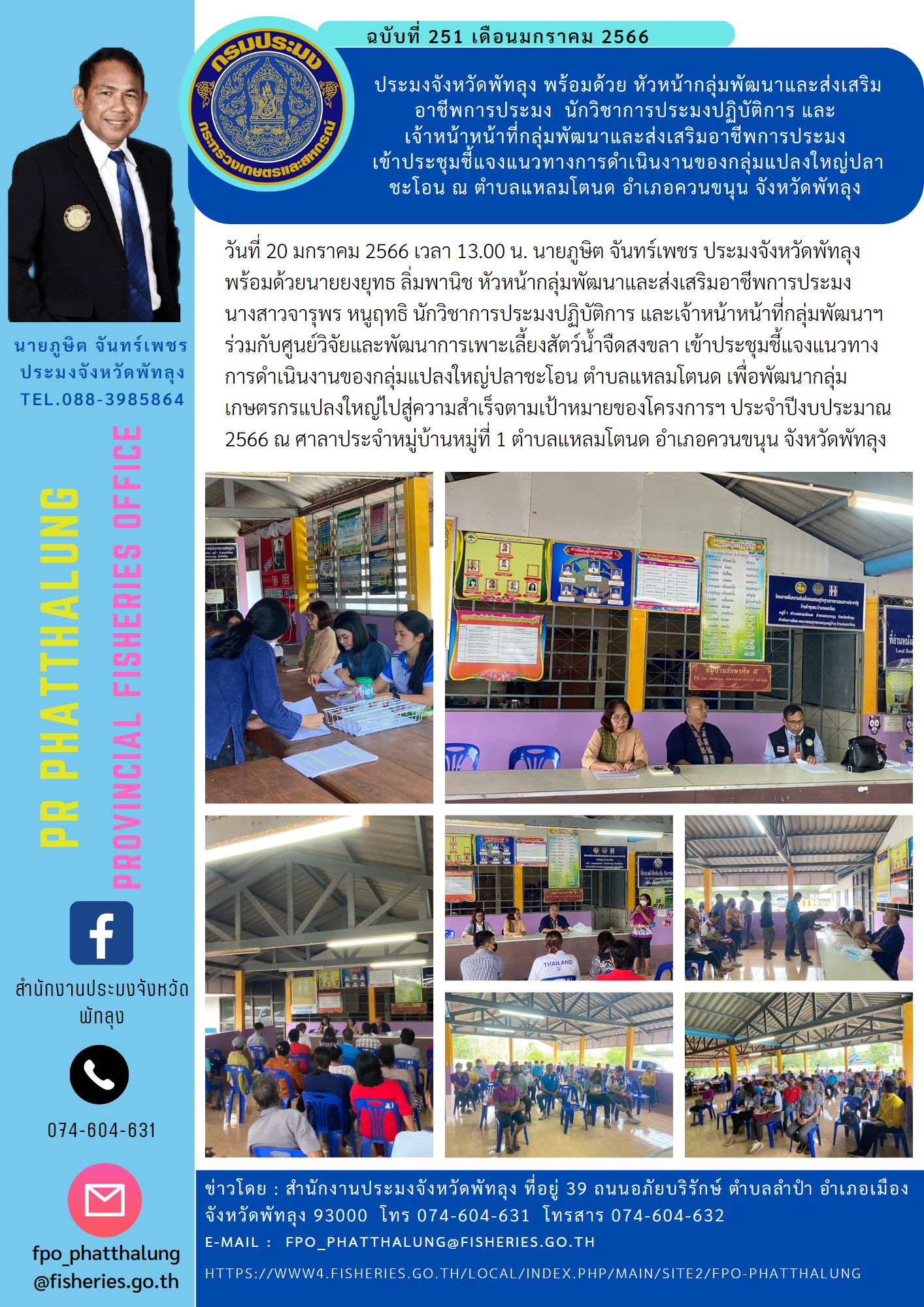 วันที่ 20 มกราคม 2566 เวลา 13.00 น. นายภูษิต จันทร์เพชร ประมงจังหวัดพัทลุง พร้อมด้วยนายยงยุทธ ลิ่มพานิช หัวหน้ากลุ่มพัฒนาและส่งเสริมอาชีพการประมง? นางสาวจารุพร หนูฤทธิ นักวิชาการประมงปฏิบัติการ และเจ้าหน้าหน้าที่กลุ่มพัฒนาฯ ร่วมกับศูนย์วิจัยและพัฒนาการเพาะเลี้ยงสัตว์น้ำจืดสงขลา เข้าประชุมชี้แจงแนวทางการดำเนินงานของกลุ่มแปลงใหญ่ปลาชะโอน ตำบลแหลมโตนด เพื่อพัฒนากลุ่มเกษตรกรแปลงใหญ่ไปสู่ความสำเร็จตามเป้าหมายของโครงการฯ ประจำปีงบประมาณ 2566 ณ ศาลาประจำหมู่บ้านหมู่ที่ 1 ตำบลแหลมโตนด อำเภอควนขนุน จังหวัดพัทลุง