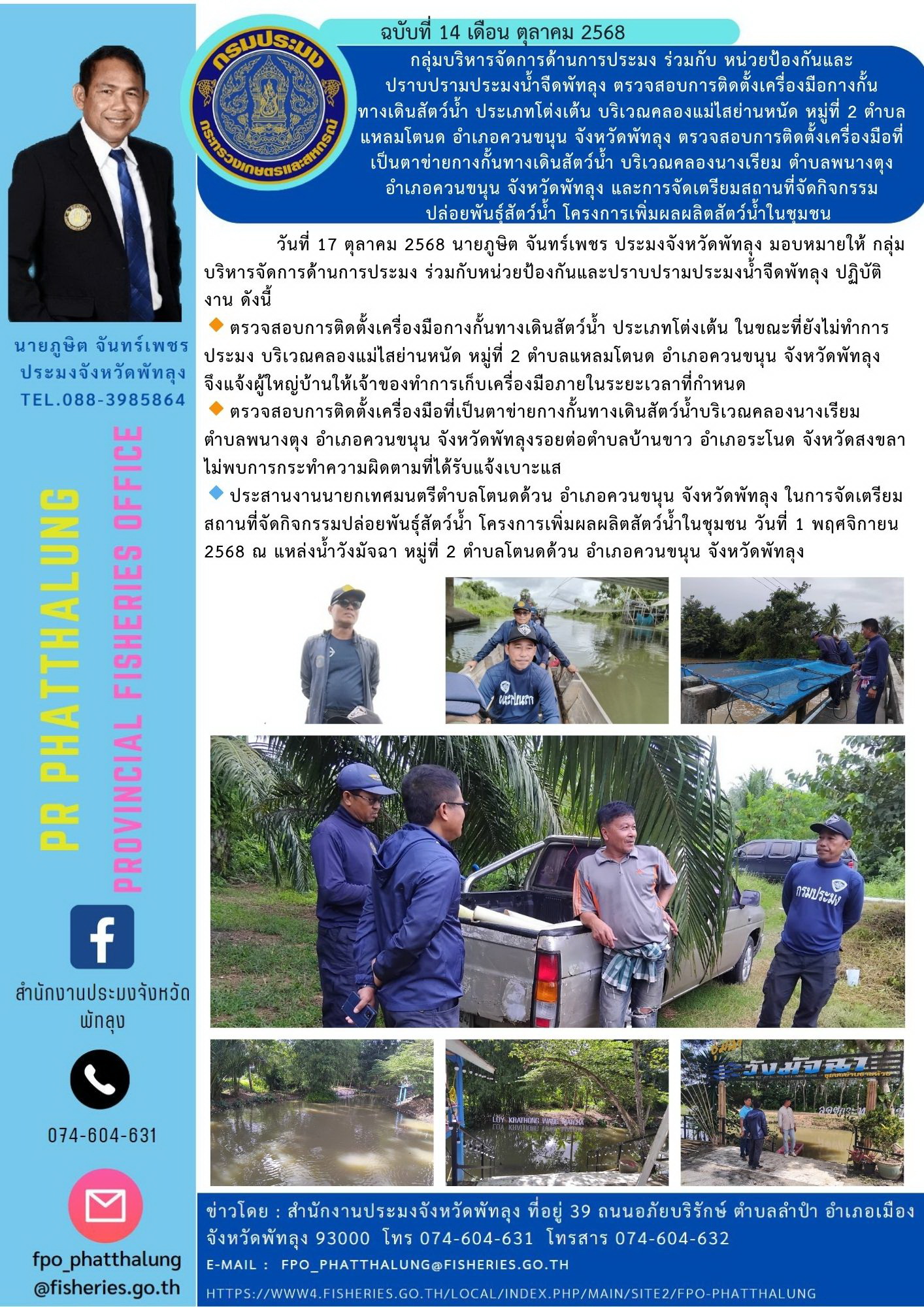 วันที่ 17 ตุลาคม 2568 นายภูษิต จันทร์เพชร ประมงจังหวัดพัทลุง มอบหมายให้ กลุ่มบริหารจัดการด้านการประมง ร่วมกับหน่วยป้องกันและปราบปรามประมงน้ำจืดพัทลุง ปฏิบัติงาน ดังนี้