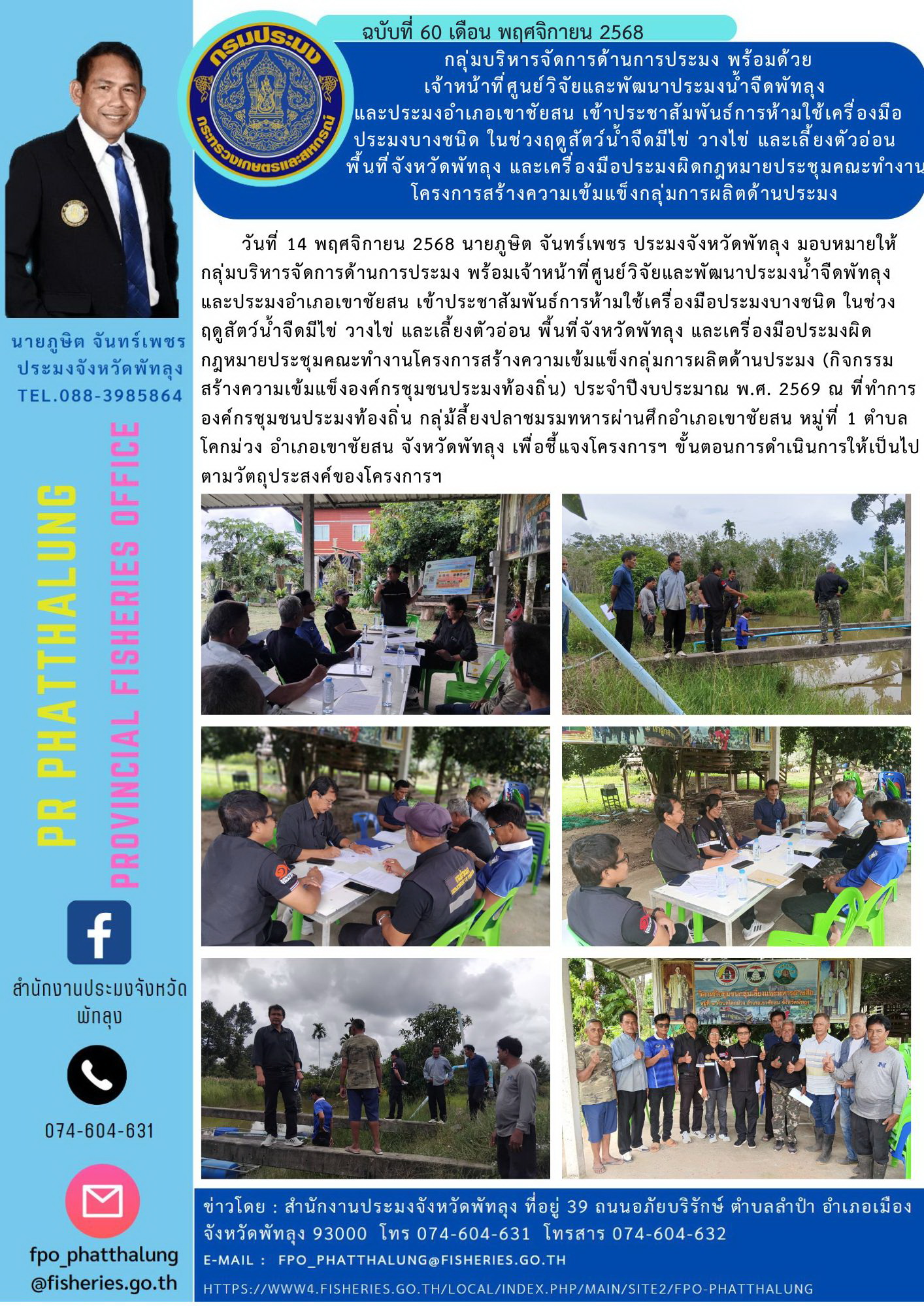 วันที่ 14 พฤศจิกายน 2568 นายภูษิต จันทร์เพชร ประมงจังหวัดพัทลุง มอบหมายให้ กลุ่มบริหารจัดการด้านการประมง พร้อมเจ้าหน้าที่ศูนย์วิจัยและพัฒนาประมงน้ำจืดพัทลุงและประมงอำเภอเขาชัยสน เข้าประชาสัมพันธ์การห้ามใช้เครื่องมือประมงบางชนิด ในช่วงฤดูสัตว์น้ำจืดมีไข่ วางไข่ และเลี้ยงตัวอ่อน พื้นที่จังหวัดพัทลุง และเครื่องมือประมงผิดกฎหมาย?ประชุมคณะทำงานโครงการสร้างความเข้มแข็งกลุ่มการผลิตด้านประมง (กิจกรรมสร้างความเข้มแข็งองค์กรชุมชนประมงท้องถิ่น) ประจำปีงบประมาณ พ.ศ. 2569 ณ ที่ทำการองค์กรชุมชนประมงท้องถิ่น กลุ่ม้ลี้ยงปลาชมรมทหารผ่านศึกอำเภอเขาชัยสน หมู่ที่ 1 ตำบลโคกม่วง อำเภอเขาชัยสน จังหวัดพัทลุง เพื่อชี้แจงโครงการฯ ขั้นตอนการดำเนินการให้เป็นไปตามวัตถุประสงค์ของโครงการฯ