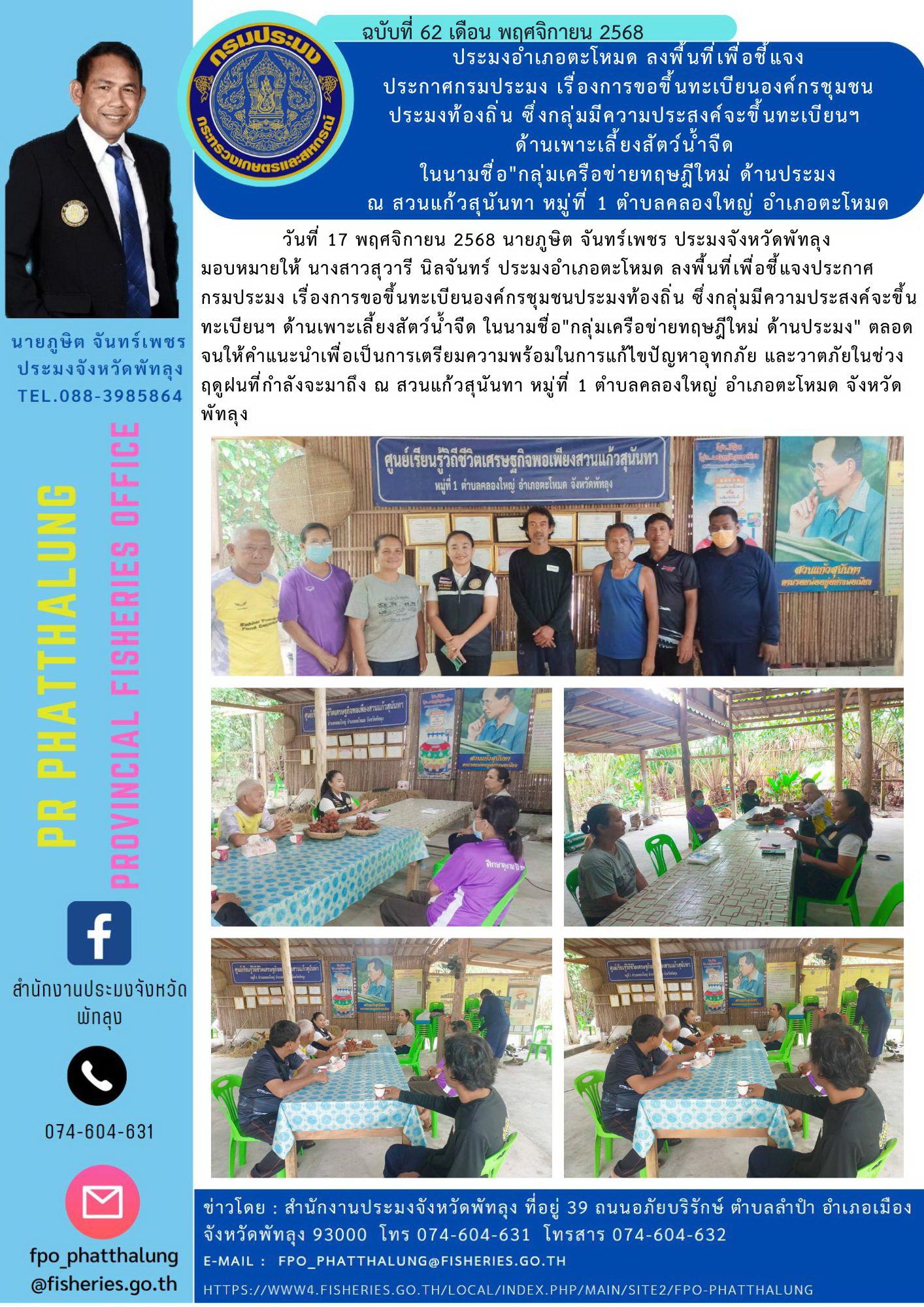 วันที่ 17 พฤศจิกายน 2568 นายภูษิต จันทร์เพชร ประมงจังหวัดพัทลุง มอบหมายให้ นางสาวสุวารี นิลจันทร์ ประมงอำเภอตะโหมด ลงพื้นที่เพื่อชี้แจงประกาศกรมประมง เรื่องการขอขึ้นทะเบียนองค์กรชุมชนประมงท้องถิ่น ซึ่งกลุ่มมีความประสงค์จะขึ้นทะเบียนฯ ด้านเพาะเลี้ยงสัตว์น้ำจืด ในนามชื่อ"กลุ่มเครือข่ายทฤษฎีใหม่ ด้านประมง" ตลอดจนให้คำแนะนำเพื่อเป็นการเตรียมความพร้อมในการแก้ไขปัญหาอุทกภัย และวาตภัยในช่วงฤดูฝนที่กำลังจะมาถึง ณ สวนแก้วสุนันทา หมู่ที่ 1 ตำบลคลองใหญ่ อำเภอตะโหมด จังหวัดพัทลุง