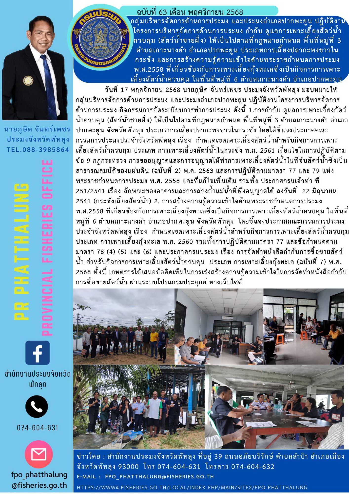 วันที่ 17 พฤศจิกายน 2568 นายภูษิต จันทร์เพชร ประมงจังหวัดพัทลุง มอบหมายให้ กลุ่มบริหารจัดการด้านการประมง และประมงอำเภอปากพะยูน ปฏิบัติงานโครงการบริหารจัดการด้านการประมง กิจกรรมการจัดระเบียบการทำการประมง ดังนี้ 1.การกำกับ ดูแลการเพาะเลี้ยงสัตว์น้ำควบคุม (สัตว์น้ำชายฝั่ง) ให้เป็นไปตามที่กฎหมายกำหนด พื้นที่หมู่ที่ 3 ตำบลเกาะนางคำ อำเภอปากพะยูน จังหวัดพัทลุง ประเภทการเลี้ยงปลากะพงขาวในกระชัง โดยได้ชี้แจงประกาศคณะกรรมการประมงประจำจังหวัดพัทลุง เรื่อง กำหนดเขตเพาะเลี้ยงสัตว์น้ำสำหรับกิจการการเพาะเลี้ยงสัตว์น้ำควบคุม ประเภท การเพาะเลี้ยงสัตว์น้ำในกระชัง พ.ศ. 2561 เงื่อนไขในการปฏิบัติตามข้อ 9 กฎกระทรวง การขออนุญาตและการอนุญาตให้ทำการเพาะเลี้ยงสัตว์น้ำในที่จับสัตว์น้ำซึ่งเป็นสาธารณสมบัติของแผ่นดิน (ฉบับที่ 2) พ.ศ. 2563 และการปฏิบัติตามมาตรา 77 และ 79 แห่งพระราชกำหนดการประมง พ.ศ. 2558 และที่แก้ไขเพิ่มเติม รวมทั้ง ประกาศกรมเจ้าท่า ที่ 251/2541 เรื่อง ลักษณะของอาคารและการล่วงล้ำแม่น้ำที่พึงอนุญาตได้ ลงวันที่ 22 มิถุนายน 2541 (กระชังเลี้ยงสัตว์น้ำ) 2. การสร้างความรู้ความเข้าใจด้านพระราชกำหนดการประมง พ.ศ.2558 ที่เกี่ยวข้องกับการเพาะเลี้ยงกุ้งทะเลซึ่งเป็นกิจการการเพาะเลี้ยงสัตว์น้ำควบคุม ในพื้นที่หมู่ที่ 6 ตำบลเกาะนางคำ อำเภอปากพะยูน จังหวัดพัทลุง โดยชี้แจงประกาศคณะกรรมการประมงประจำจังหวัดพัทลุง เรื่อง กำหนดเขตเพาะเลี้ยงสัตว์น้ำสำหรับกิจการการเพาะเลี้ยงสัตว์น้ำควบคุม ประเภท การเพาะเลี้ยงกุ้งทะเล พ.ศ. 2560 รวมทั้งการปฏิบัติตามมาตรา 77 และข้อกำหนดตามมาตรา 78 (4) (5) และ (6) และประกาศกรมประมง เรื่อง การจัดทำหนังสือกำกับการซื้อขายสัตว์น้ำ สำหรับกิจการการเพาะเลี้ยงสัตว์น้ำควบคุม ประเภท การเพาะเลี้ยงกุ้งทะเล (ฉบับที่ 7) พ.ศ. 2568 ทั้งนี้ เกษตรกรได้เสนอข้อคิดเห็นในการเร่งสร้างความรู้ความเข้าใจในการจัดทำหนังสือกำกับการซื้อขายสัตว์น้ำ ผ่านระบบโปรแกรมประยุกต์ ทางเว็บไซต์