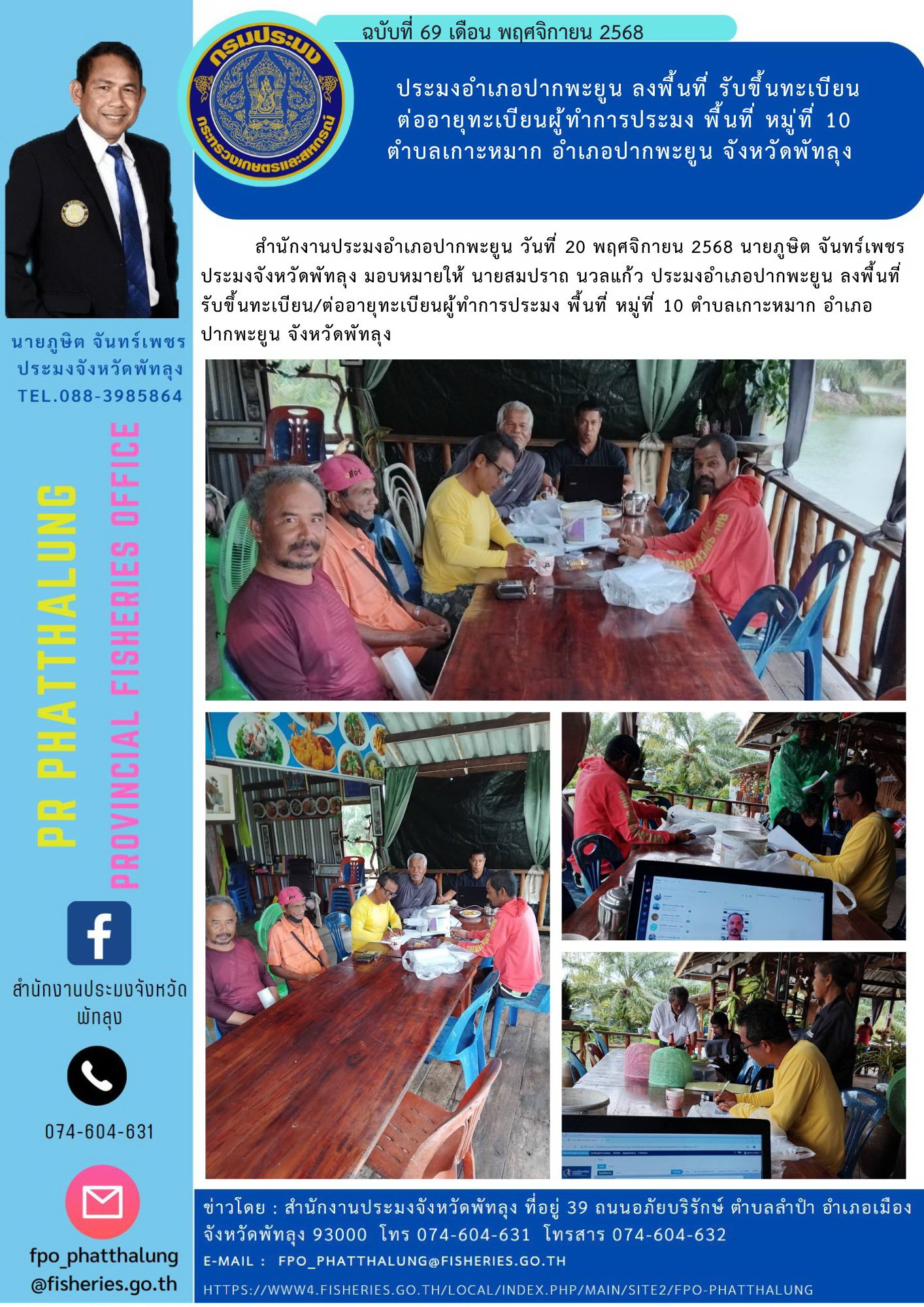 ประมงอำเภอปากพะยูน ลงพื้นที่ รับขึ้นทะเบียน ต่ออายุทะเบียนผู้ทำการประมง พื้นที่ หมู่ที่ 10 ตำบลเกาะหมาก อำเภอปากพะยูน จังหวัดพัทลุง