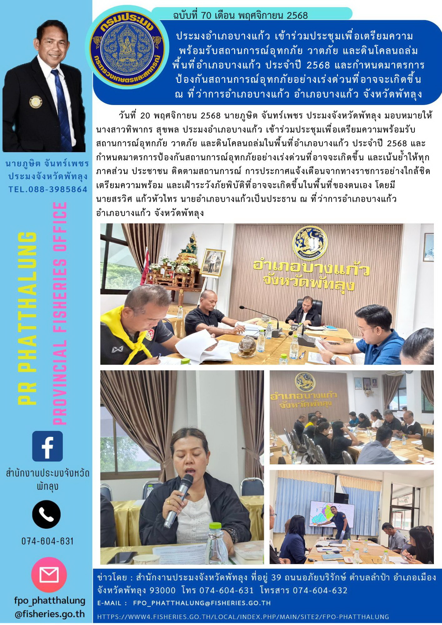 วันที่ 20 พฤศจิกายน 2568 นายภูษิต จันทร์เพชร ประมงจังหวัดพัทลุง มอบหมายให้นางสาวทิพากร สุขพล ประมงอำเภอบางแก้ว เข้าร่วมประชุมเพื่อเตรียมความพร้อมรับสถานการณ์อุทกภัย วาตภัย และดินโคลนถล่มในพื้นที่อำเภอบางแก้ว ประจำปี 2568 และกำหนดมาตรการป้องกันสถานการณ์อุทกภัยอย่างเร่งด่วนที่อาจจะเกิดขึ้น และเน้นย้ำให้ทุกภาคส่วน ประชาชน ติดตามสถานการณ์ การประกาศแจ้งเตือนจากทางราชการอย่างใกล้ชิด เตรียมความพร้อม และเฝ้าระวังภัยพิบัติที่อาจจะเกิดขึ้นในพื้นที่ของตนเอง โดยมี นายสรวิศ แก้วหัวไทร นายอำเภอบางแก้วเป็นประธาน ณ ที่ว่าการอำเภอบางแก้ว
