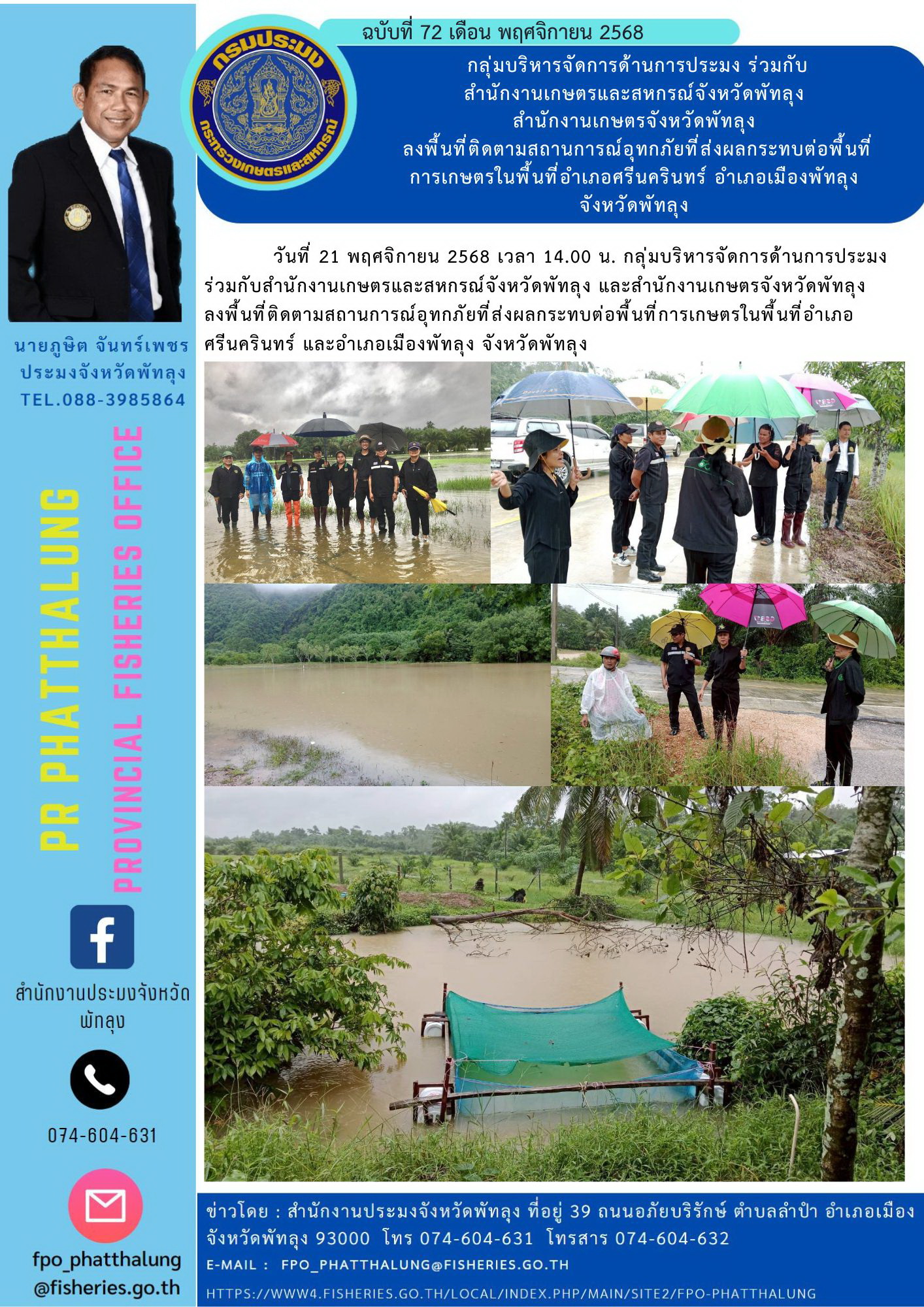 วันที่ 21 พฤศจิกายน 2568 เวลา 14.00 น. กลุ่มบริหารจัดการด้านการประมง ร่วมกับสำนักงานเกษตรและสหกรณ์จังหวัดพัทลุง และสำนักงานเกษตรจังหวัดพัทลุง ลงพื้นที่ติดตามสถานการณ์อุทกภัยที่ส่งผลกระทบต่อพื้นที่การเกษตรในพื้นที่อำเภอศรีนครินทร์ และอำเภอเมืองพัทลุง จังหวัดพัทลุง