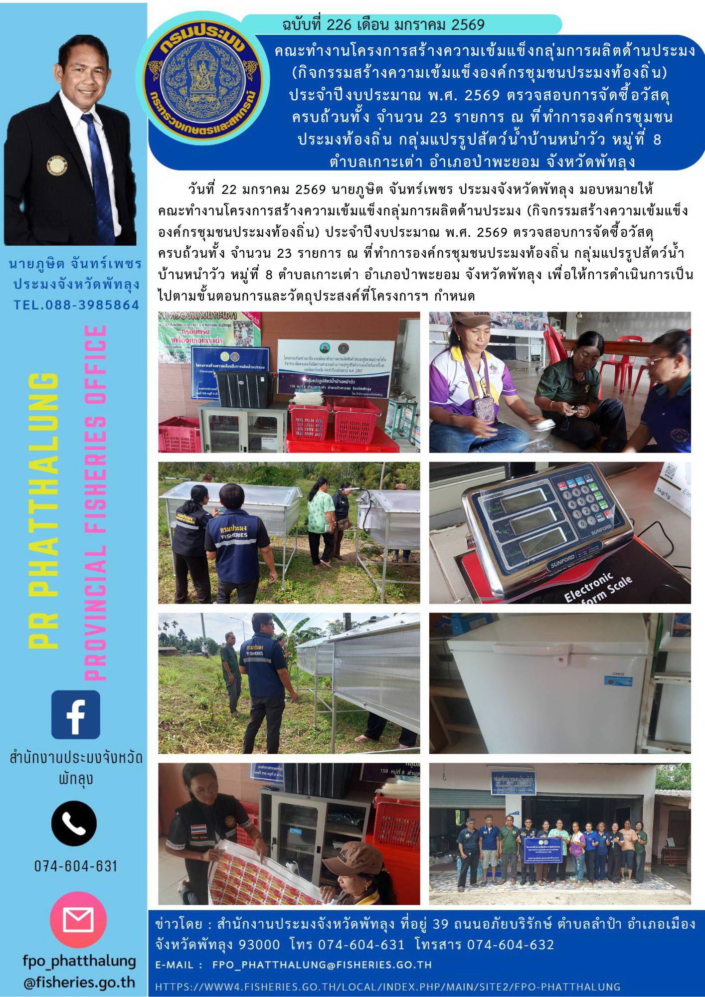 วันที่ 22 มกราคม 2569 นายภูษิต จันทร์เพชร ประมงจังหวัดพัทลุง มอบหมายให้ คณะทำงานโครงการสร้างความเข้มแข็งกลุ่มการผลิตด้านประมง (กิจกรรมสร้างความเข้มแข็งองค์กรชุมชนประมงท้องถิ่น) ประจำปีงบประมาณ พ.ศ. 2569 ตรวจสอบการจัดซื้อวัสดุครบถ้วนทั้ง จำนวน 23 รายการ ณ ที่ทำการองค์กรชุมชนประมงท้องถิ่น กลุ่มแปรรูปสัตว์น้ำบ้านหนำวัว หมู่ที่ 8 ตำบลเกาะเต่า อำเภอป่าพะยอม จังหวัดพัทลุง เพื่อให้การดำเนินการเป็นไปตามขั้นตอนการและวัตถุประสงค์ที่โครงการฯ กำหนด