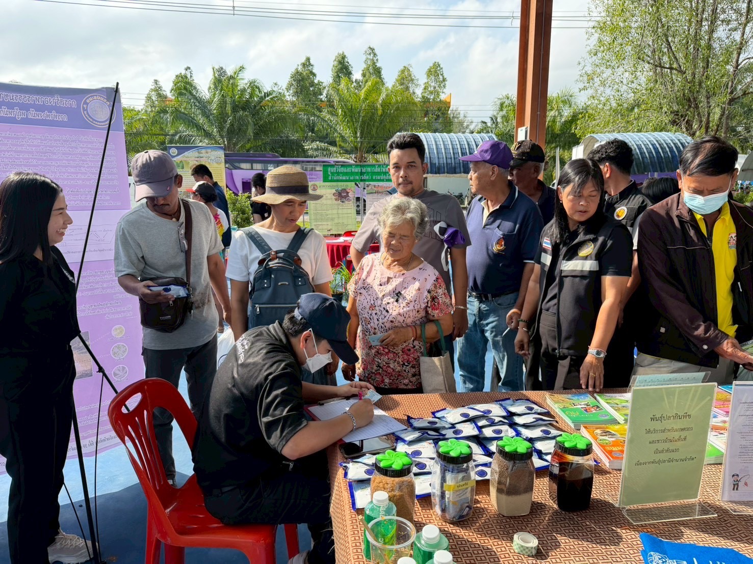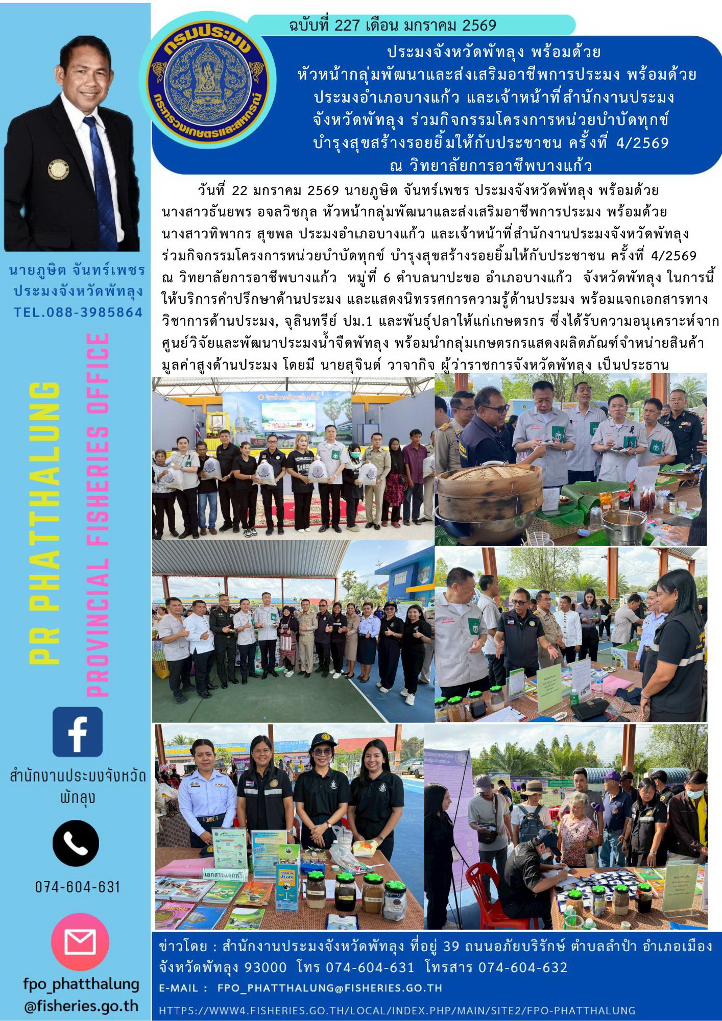 วันที่ 22 มกราคม 2569 นายภูษิต จันทร์เพชร ประมงจังหวัดพัทลุง พร้อมด้วย นางสาวธันยพร อจลวิชกุล หัวหน้ากลุ่มพัฒนาและส่งเสริมอาชีพการประมง พร้อมด้วย นางสาวทิพากร สุขพล ประมงอำเภอบางแก้ว และเจ้าหน้าที่สำนักงานประมงจังหวัดพัทลุง ร่วมกิจกรรมโครงการหน่วยบำบัดทุกข์ บำรุงสุขสร้างรอยยิ้มให้กับประชาชน ครั้งที่ 4/2569 ณ วิทยาลัยการอาชีพบางแก้ว หมู่ที่ 6 ตำบลนาปะขอ อำเภอบางแก้ว จังหวัดพัทลุง ในการนี้ให้บริการคำปรึกษาด้านประมง และแสดงนิทรรศการความรู้ด้านประมง พร้อมแจกเอกสารทางวิชาการด้านประมง, จุลินทรีย์ ปม.1 และพันธุ์ปลาให้แก่เกษตรกร ซึ่งได้รับความอนุเคราะห์จากศูนย์วิจัยและพัฒนาประมงน้ำจืดพัทลุง พร้อมนำกลุ่มเกษตรกรแสดงผลิตภัณฑ์จำหน่ายสินค้ามูลค่าสูงด้านประมง โดยมี นายสุจินต์ วาจากิจ ผู้ว่าราชการจังหวัดพัทลุง เป็นประธาน