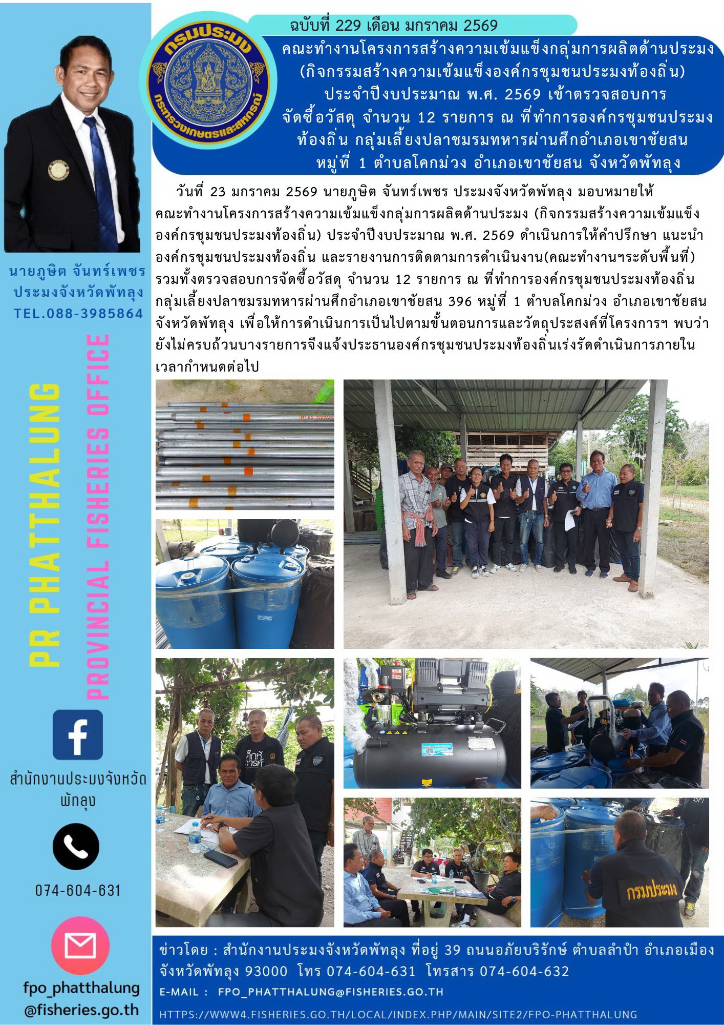 วันที่ 23 มกราคม 2569 นายภูษิต จันทร์เพชร ประมงจังหวัดพัทลุง มอบหมายให้ คณะทำงานโครงการสร้างความเข้มแข็งกลุ่มการผลิตด้านประมง (กิจกรรมสร้างความเข้มแข็งองค์กรชุมชนประมงท้องถิ่น) ประจำปีงบประมาณ พ.ศ. 2569 ดำเนินการให้คำปรึกษา แนะนำองค์กรชุมชนประมงท้องถิ่น และรายงานการติดตามการดำเนินงาน(คณะทำงานฯระดับพื้นที่) รวมทั้งตรวจสอบการจัดซื้อวัสดุ จำนวน 12 รายการ ณ ที่ทำการองค์กรชุมชนประมงท้องถิ่น กลุ่มเลี้ยงปลาชมรมทหารผ่านศึกอำเภอเขาชัยสน 396 หมู่ที่ 1 ตำบลโคกม่วง อำเภอเขาชัยสน จังหวัดพัทลุง เพื่อให้การดำเนินการเป็นไปตามขั้นตอนการและวัตถุประสงค์ที่โครงการฯ พบว่า ยังไม่ครบถ้วนบางรายการจึงแจ้งประธานองค์กรชุมชนประมงท้องถิ่นเร่งรัดดำเนินการภายในเวลากำหนดต่อไป