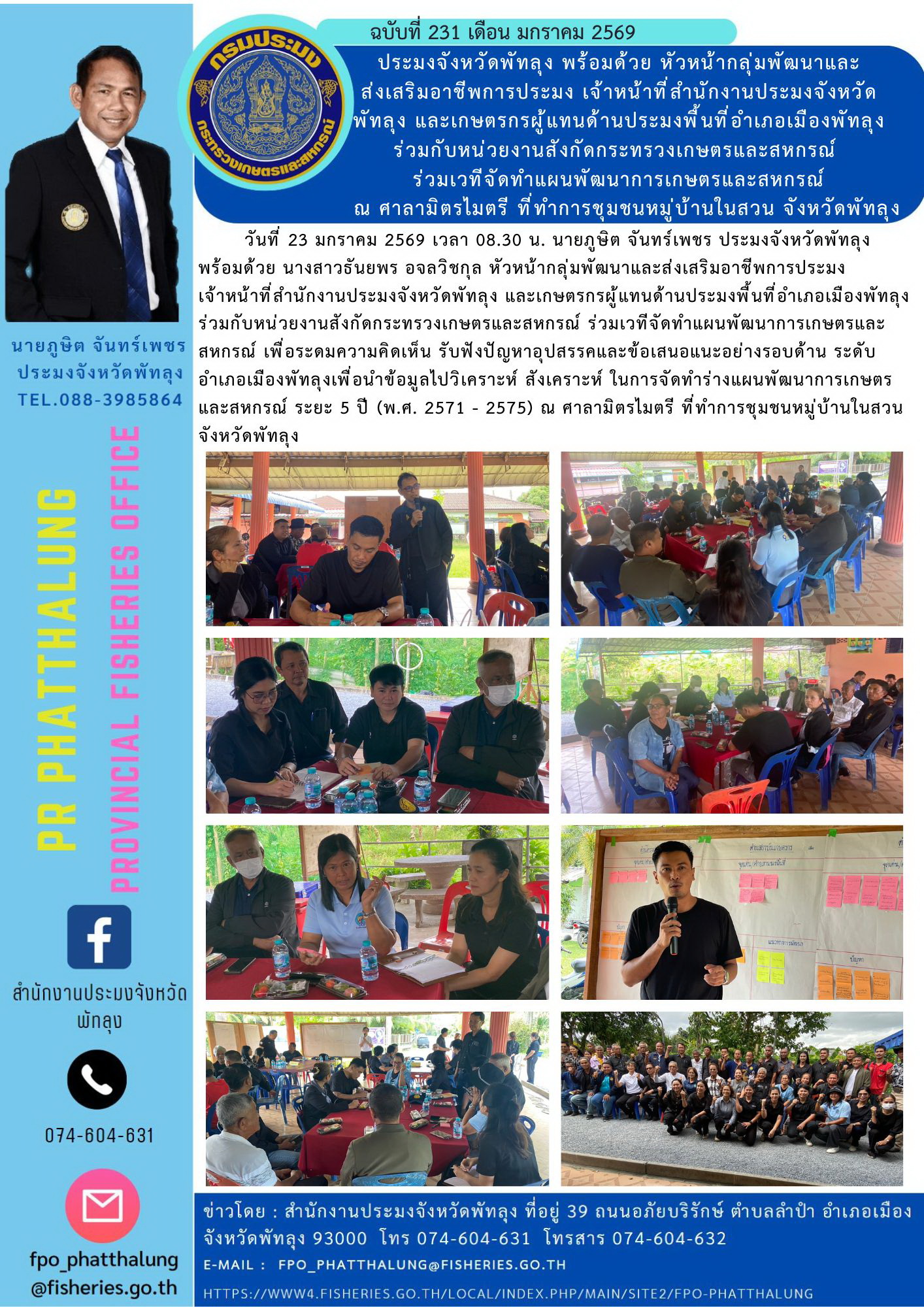 วันที่ 23 มกราคม 2569 เวลา 08.30 น. นายภูษิต จันทร์เพชร ประมงจังหวัดพัทลุง พร้อมด้วย นางสาวธันยพร อจลวิชกุล หัวหน้ากลุ่มพัฒนาและส่งเสริมอาชีพการประมง เจ้าหน้าที่สำนักงานประมงจังหวัดพัทลุง และเกษตรกรผู้แทนด้านประมงพื้นที่อำเภอเมืองพัทลุง ร่วมกับหน่วยงานสังกัดกระทรวงเกษตรและสหกรณ์ ร่วมเวทีจัดทำแผนพัฒนาการเกษตรและสหกรณ์ เพื่อระดมความคิดเห็น รับฟังปัญหาอุปสรรคและข้อเสนอแนะอย่างรอบด้าน ระดับอำเภอเมืองพัทลุงเพื่อนำข้อมูลไปวิเคราะห์ สังเคราะห์ ในการจัดทำร่างแผนพัฒนาการเกษตรและสหกรณ์ ระยะ 5 ปี (พ.ศ. 2571 - 2575) ณ ศาลามิตรไมตรี ที่ทำการชุมชนหมู่บ้านในสวน จังหวัดพัทลุง